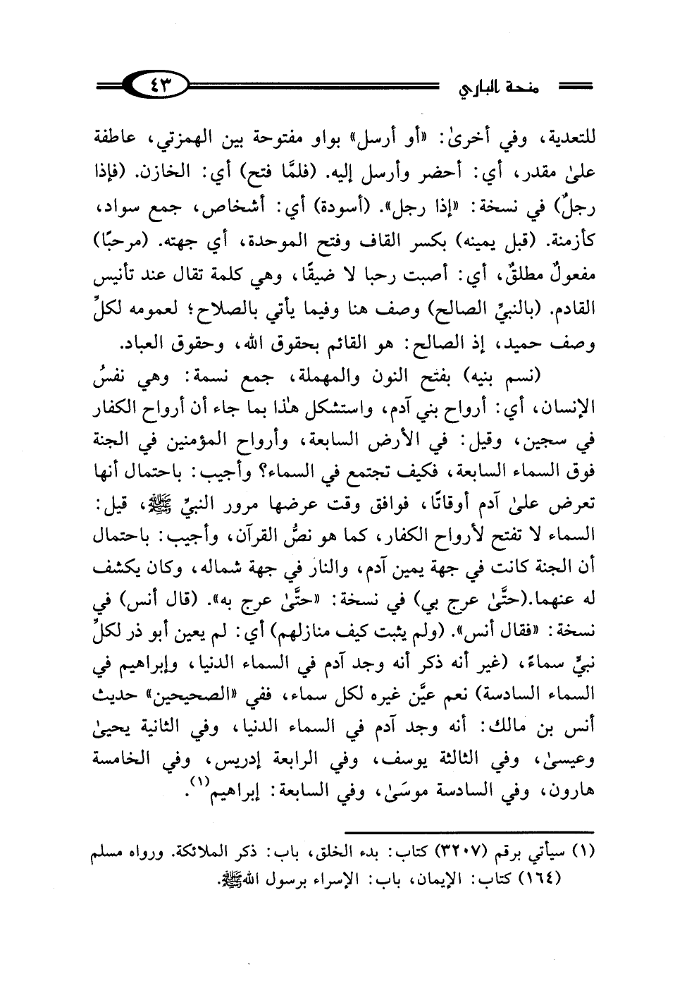 (نسم بنيه) بفتح النون والمهملة، جمع نسمة: وهي نفسُ الإنسان، أي: أرواح بني آدم، واستشكل هذا بما جاء أن أرواح الكفار في سجين، وقيل: في الأرض السابعة، وأرواح المؤمنين في الجنة فوق السماء السابعة، فكيف تجتمع في السماء؟ وأجيب: باحتمال أنها تعرض على آدم أوقاتًا، فوافق وقت عرضها مرور النبيِّ صلى الله عليه وسلم، قيل: السماء لا تفتح لأرواح الكفار، كما هو نصُّ القرآن، وأجيب: باحتمال أن الجنة كانت في جهة يمين آدم، والنار في جهة شماله، وكان يكشف له عنهما. (حتَّى عرج بي) في نسخة: "حتَّى عرج به". (قال أنس) في نسخة: "فقال أنس". (ولم يثبت كيف منازلهم) أي: لم يعين أَبو ذر لكلِّ نبيٍّ سماءً، (غير أنه ذكر أنه وجد آدم في السماء الدنيا، وإبراهيم في السماء السادسة) نعم عيَّن غيره لكل سماء، ففي "الصحيحين" حديث أنس بن مالك: أنه وجد آدم في السماء الدنيا، وفي الثانية يحيى وعيسى، وفي الثالثة يوسف، وفي الرابعة إدريس، وفي الخامسة هارون، وفي السادسة موسَى، وفي السابعة: إبراهيم (¬1).