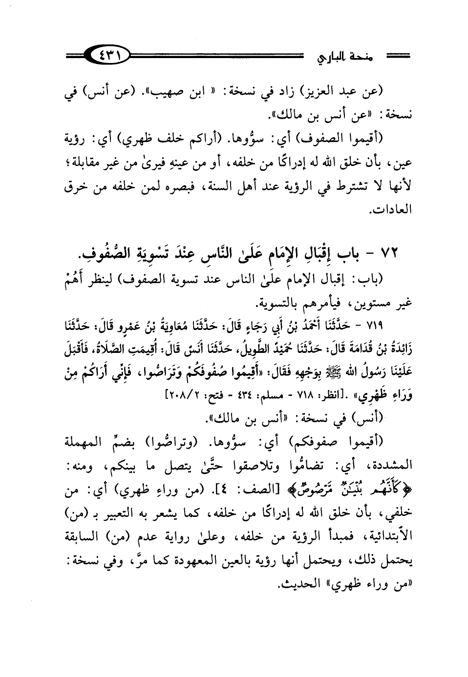 (أقيموا الصفوف) أي: سوُّوها. (أراكم خلف ظهري) أي: رؤية عين، بأن خلق الله له إدراكًا من خلفه، أو من عينهِ فيرى من غير مقابلة؛ لأنها لا تشترط في الرؤية عند أهل السنة، فبصره لمن خلفه من خرق العادات.