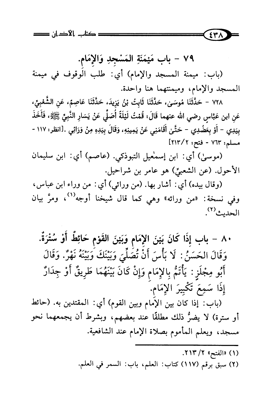 728 - حَدَّثَنَا مُوسَى، حَدَّثَنَا ثَابِتُ بْنُ يَزِيدَ، حَدَّثَنَا عَاصِمٌ، عَنِ الشَّعْبِيِّ، عَنِ ابْنِ عَبَّاسٍ رَضِيَ اللَّهُ عَنْهُمَا، قَال: "قُمْتُ لَيْلَةً أُصَلِّي عَنْ يَسَارِ النَّبِيِّ صَلَّى اللهُ عَلَيْهِ وَسَلَّمَ فَأَخَذَ بِيَدِي - أَوْ بِعَضُدِي - حَتَّى أَقَامَنِي عَنْ يَمِينِهِ، وَقَال بِيَدِهِ مِنْ وَرَائِي".