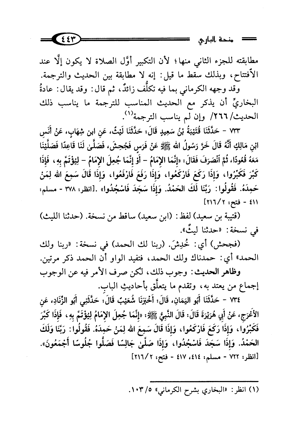 733 - حَدَّثَنَا قُتَيْبَةُ بْنُ سَعِيدٍ، قَال: حَدَّثَنَا لَيْثٌ، عَنِ ابْنِ شِهَابٍ، عَنْ أَنَسِ بْنِ مَالِكٍ، أَنَّهُ قَال: خَرَّ رَسُولُ اللَّهِ صَلَّى اللهُ عَلَيْهِ وَسَلَّمَ عَنْ فَرَسٍ، فَجُحِشَ، فَصَلَّى لَنَا قَاعِدًا فَصَلَّيْنَا مَعَهُ قُعُودًا، ثُمَّ انْصَرَفَ، فَقَال: "إِنَّمَا الإِمَامُ - أَوْ إِنَّمَا جُعِلَ الإِمَامُ - لِيُؤْتَمَّ بِهِ، فَإِذَا كَبَّرَ فَكَبِّرُوا، وَإِذَا رَكَعَ فَارْكَعُوا، وَإِذَا رَفَعَ فَارْفَعُوا، وَإِذَا قَال: سَمِعَ اللَّهُ لِمَنْ حَمِدَهُ، فَقُولُوا: رَبَّنَا لَكَ الحَمْدُ، وَإِذَا سَجَدَ فَاسْجُدُوا".