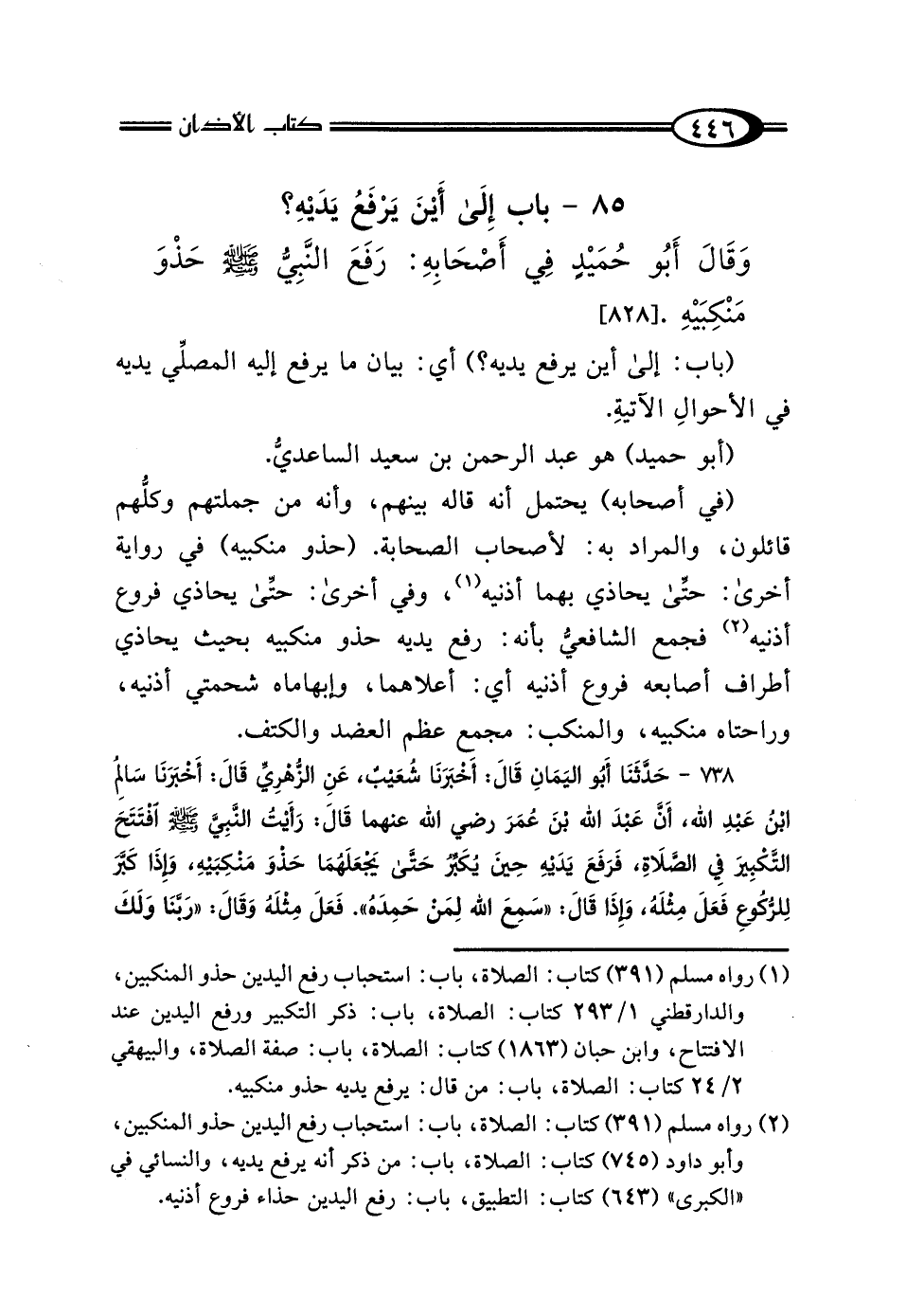 738 - حَدَّثَنَا أَبُو اليَمَانِ، قَال: أَخْبَرَنَا شُعَيْبٌ، عَنِ الزُّهْرِيِّ، قَال: أَخْبَرَنَا سَالِمُ بْنُ عَبْدِ اللَّهِ، أَنَّ عَبْدَ اللَّهِ بْنَ عُمَرَ رَضِيَ اللَّهُ عَنْهُمَا، قَال: "رَأَيْتُ النَّبِيَّ صَلَّى اللهُ عَلَيْهِ وَسَلَّمَ افْتَتَحَ التَّكْبِيرَ فِي الصَّلاةِ، فَرَفَعَ يَدَيْهِ حِينَ يُكَبِّرُ حَتَّى 5 يَجْعَلَهُمَا حَذْوَ مَنْكِبَيْهِ، وَإِذَا كَبَّرَ لِلرُّكُوعِ فَعَلَ مِثْلَهُ، وَإِذَا قَال: سَمِعَ اللَّهُ لِمَنْ حَمِدَهُ، فَعَلَ مِثْلَهُ، وَقَال: رَبَّنَا وَلَكَ