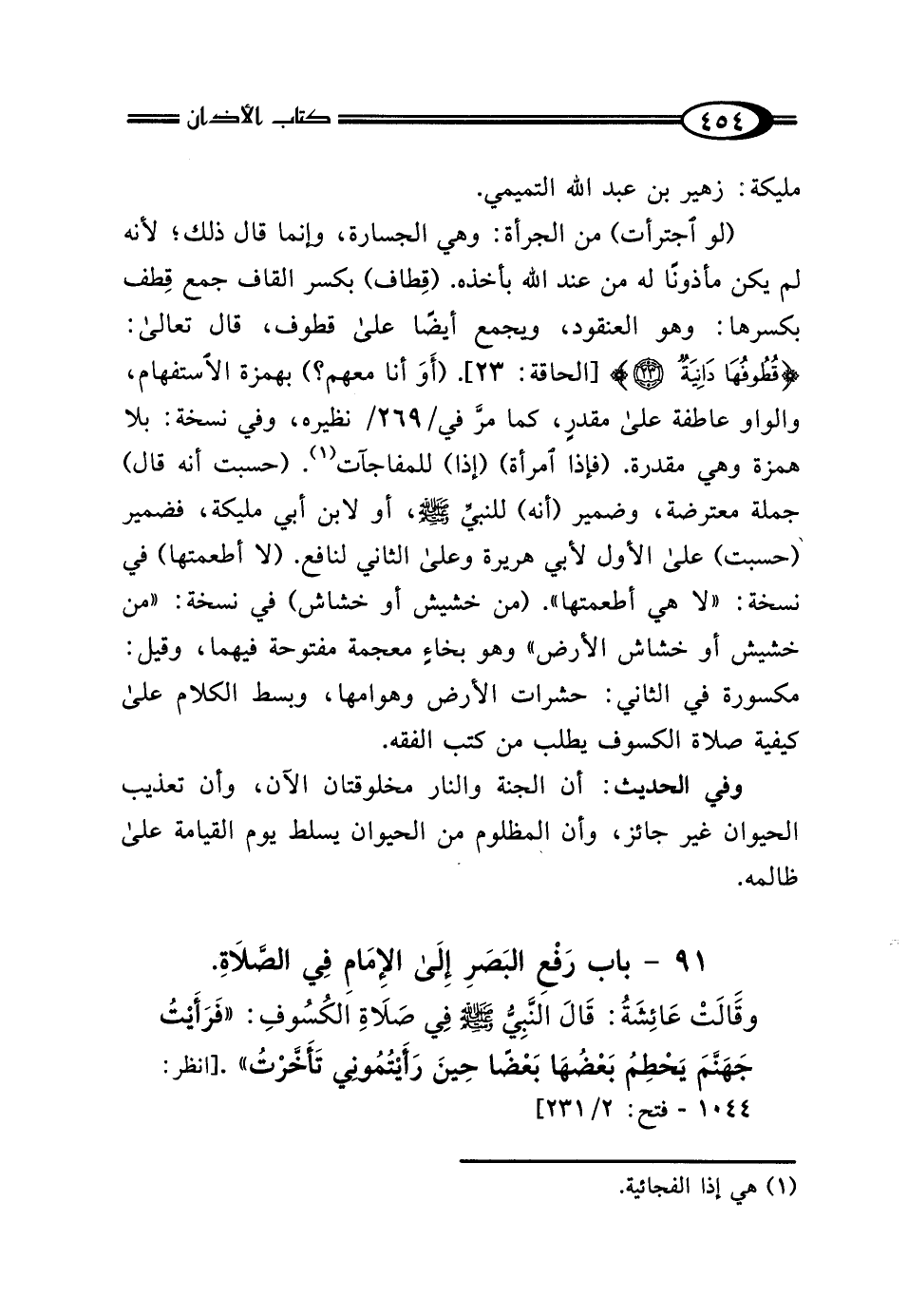 (لو اجترأت) من الجرأة: وهي الجسارة، وإنما قال ذلك؛ لأنه لم يكن مأذونًا له من عند الله بأخذه. (قِطاف) بكسر القاف جمع قِطف بكسرها: وهو العنقود، ويجمع أيضًا على قطوف، قال تعالى: {قُطُوفُهَا دَانِيَةٌ (23)} [الحاقة: 23]. (أَوَ أنا معهم؟) بهمزة الاستفهام، والواو عاطفة على مقدرٍ، كما مرَّ في نظيره، وفي نسخة: بلا همزة وهي مقدرة. (فإذا امرأة) (إذا) للمفاجآت (¬1). (حسبت أنه قال) جملة معترضة، وضمير (أنه) للنبي - صلى الله عليه وسلم -، أو لابن أبي مليكة، فضمير (حسبت) على الأول لأبي هريرة وعلى الثاني لنافع. (لا أطعمتها) في نسخة: "لا هي أطعمتها". (من خشيش أو خشاش) في نسخة: "من خشيش أو خشاش الأرض" وهو بخاءٍ معجمة مفتوحة فيهما، وقيل: مكسورة في الثاني: حشرات الأرض وهوامها، وبسط الكلام على كيفية صلاة الكسوف يطلب من كتب الفقه.