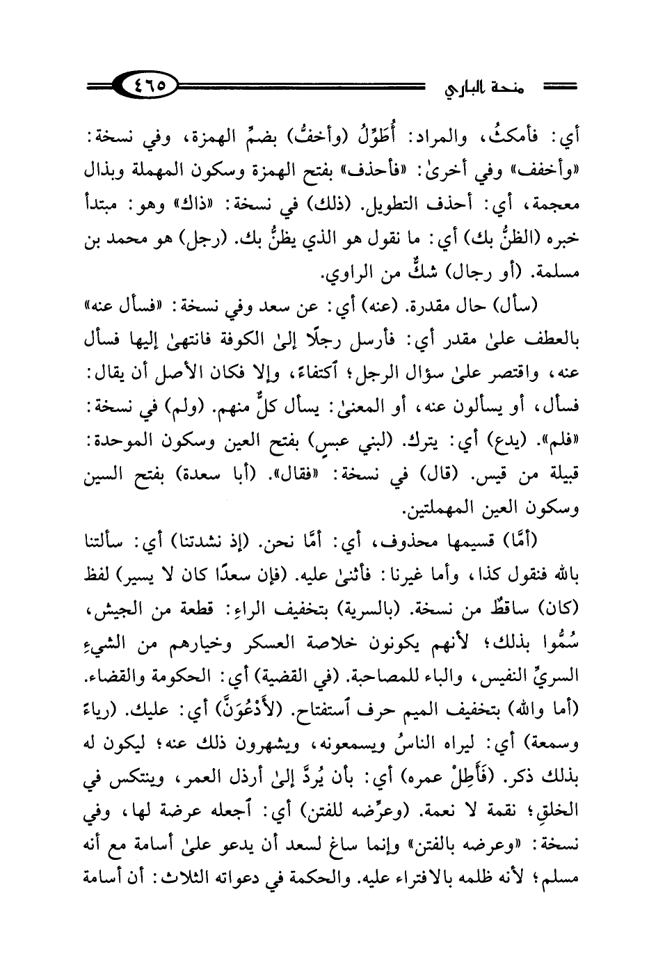 (أما) قسيمها محذوف، أي: أمَّا نحن. (إذ نشدتنا) أي: سألتنا بالله فنقول كذا، وأما غيرنا: فأثنى عليه. (فإن سعدا كان لا يسير) لفظ (كان) ساقطٌ من نسخة. (بالسرية) بتخفيف الراءِ: قطعة من الجيش، سُمُّوا بذلك؛ لأنهم يكونون خلاصة العسكر وخيارهم من الشيءِ السريِّ النفيس، والباء للمصاحبة. (في القضية) أي: الحكومة والقضاء. (أما والله) بتخفيف الميم حرف استفتاح. (لأَدْعُوَنَّ) أي: عليك. (رياءً وسمعة) أي: ليراه الناسُ ويسمعونه، ويشهرون ذلك عنه؛ ليكون له بذلك ذكر. (فَأطِلْ عمره) أي: بأن يُردَّ إلى أرذل العمر، وينتكس في الخلقِ؛ نقمة لا نعمة. (وعرِّضه للفتن) أي: اجعله عرضة لها، وفي نسخة: "وعرضه بالفتن" وإنما ساغ لسعد أن يدعو على أسامة مع أنه مسلم؛ لأنه ظلمه بالافتراء عليه. والحكمة في دعواته الثلاث: أن أسامة