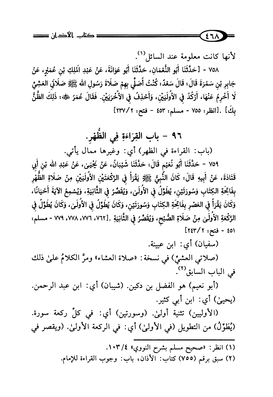 759 - حَدَّثَنَا أَبُو نُعَيْمٍ، قَال: حَدَّثَنَا شَيْبَانُ، عَنْ يَحْيَى، عَنْ عَبْدِ اللَّهِ بْنِ أَبِي قَتَادَةَ، عَنْ أَبِيهِ، قَال: "كَانَ النَّبِيُّ صَلَّى اللهُ عَلَيْهِ وَسَلَّمَ يَقْرَأُ فِي الرَّكْعَتَيْنِ الأُولَيَيْنِ مِنْ صَلاةِ الظُّهْرِ بِفَاتِحَةِ الكِتَابِ، وَسُورَتَيْنِ يُطَوِّلُ فِي الأُولَى، وَيُقَصِّرُ فِي الثَّانِيَةِ وَيُسْمِعُ الآيَةَ أَحْيَانًا، وَكَانَ يَقْرَأُ فِي العَصْرِ بِفَاتِحَةِ الكِتَابِ وَسُورَتَيْنِ، وَكَانَ يُطَوِّلُ فِي الأُولَى، وَكَانَ يُطَوِّلُ فِي الرَّكْعَةِ الأُولَى مِنْ صَلاةِ الصُّبْحِ، وَيُقَصِّرُ فِي الثَّانِيَةِ".