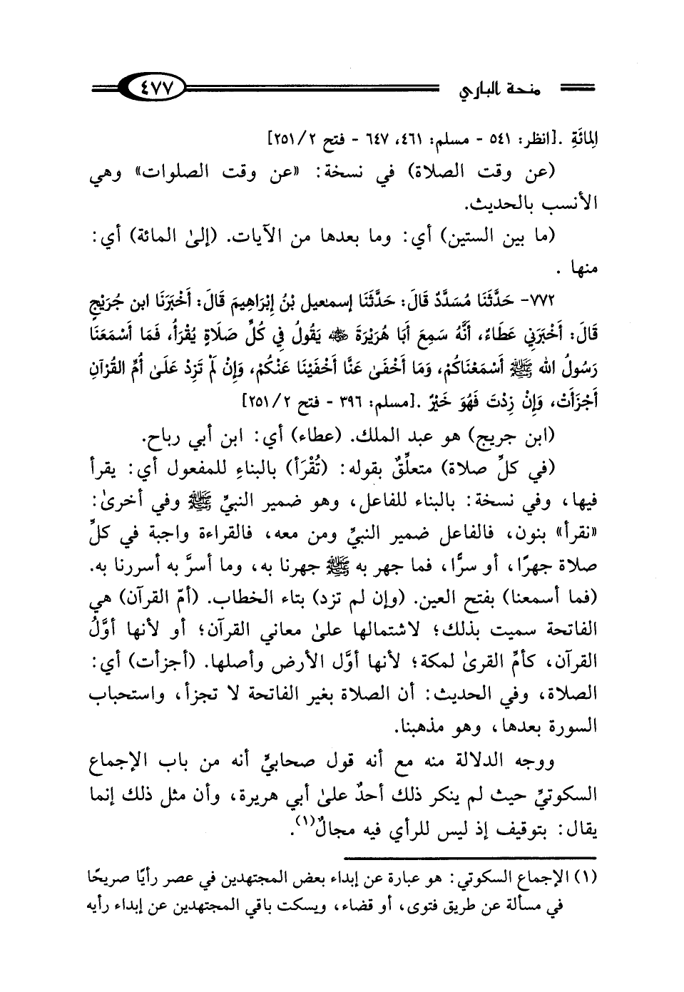 772 - حَدَّثَنَا مُسَدَّدٌ، قَال: حَدَّثَنَا إِسْمَاعِيلُ بْنُ إِبْرَاهِيمَ، قَال: أَخْبَرَنَا ابْنُ جُرَيْجٍ، قَال: أَخْبَرَنِي عَطَاءٌ، أَنَّهُ سَمِعَ أَبَا هُرَيْرَةَ رَضِيَ اللَّهُ عَنْهُ، يَقُولُ: "فِي كُلِّ صَلاةٍ يُقْرَأُ، فَمَا أَسْمَعَنَا رَسُولُ اللَّهِ صَلَّى اللهُ عَلَيْهِ وَسَلَّمَ أَسْمَعْنَاكُمْ، وَمَا أَخْفَى عَنَّا أَخْفَيْنَا عَنْكُمْ، وَإِنْ لَمْ تَزِدْ عَلَى أُمِّ القُرْآنِ أَجْزَأَتْ وَإِنْ زِدْتَ فَهُوَ خَيْرٌ".