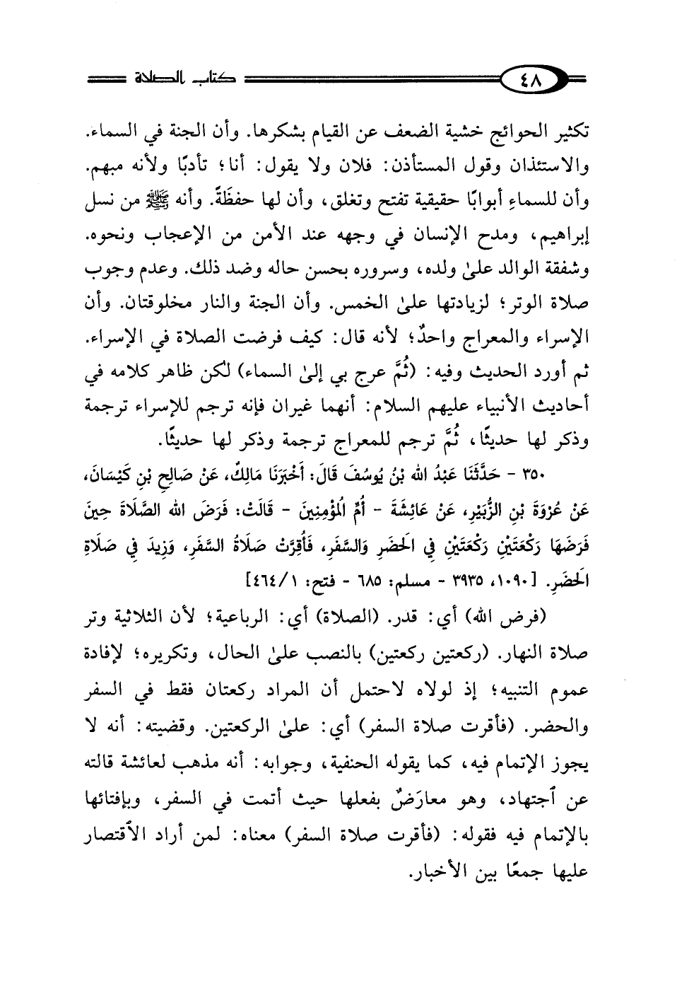 350 - حَدَّثَنَا عَبْدُ اللَّهِ بْنُ يُوسُفَ، قَالَ: أَخْبَرَنَا مَالِكٌ، عَنْ صَالِحِ بْنِ كَيْسَانَ، عَنْ عُرْوَةَ بْنِ الزُّبَيْرِ، عَنْ عَائِشَةَ أُمِّ المُؤْمِنِينَ، قَالَتْ: "فَرَضَ اللَّهُ الصَّلاةَ حِينَ فَرَضَهَا، رَكْعَتَيْنِ رَكْعَتَيْنِ، فِي الحَضَرِ وَالسَّفَرِ، فَأُقِرَّتْ صَلاةُ السَّفَرِ، وَزِيدَ فِي صَلاةِ الحَضَرِ".