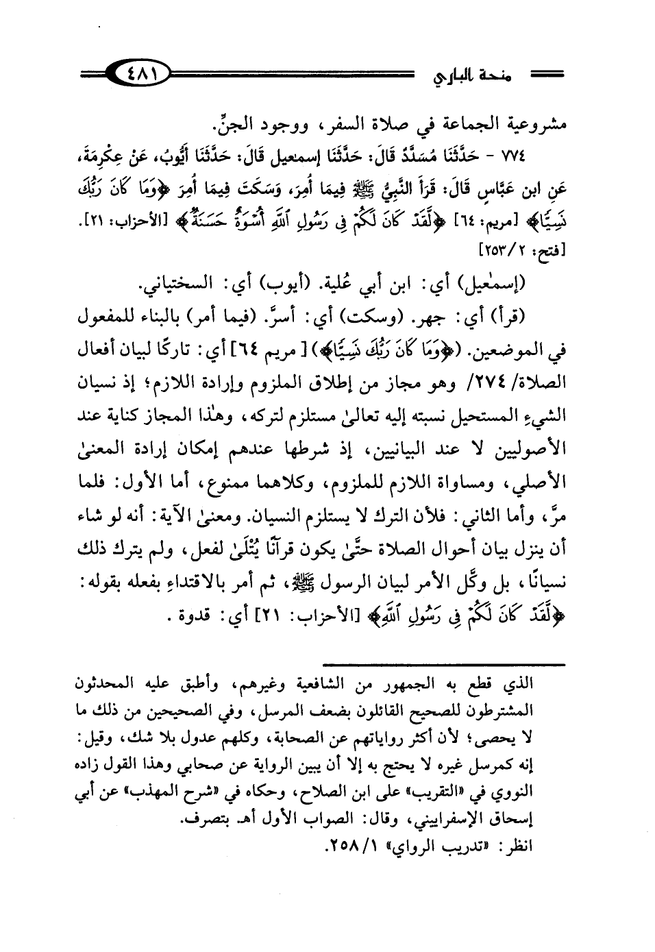 774 - حَدَّثَنَا مُسَدَّدٌ، قَال: حَدَّثَنَا إِسْمَاعِيلُ، قَال: حَدَّثَنَا أَيُّوبُ، عَنْ عِكْرِمَةَ، عَنِ ابْنِ عَبَّاسٍ، قَال: "قَرَأَ النَّبِيُّ صَلَّى اللهُ عَلَيْهِ وَسَلَّمَ فِيمَا أُمِرَ وَسَكَتَ فِيمَا أُمِرَ، {وَمَا كَانَ رَبُّكَ نَسِيًّا} [مريم: 64] {لَقَدْ كَانَ لَكُمْ فِي رَسُولِ اللَّهِ أُسْوَةٌ حَسَنَةٌ} [الأحزاب: 21] ".