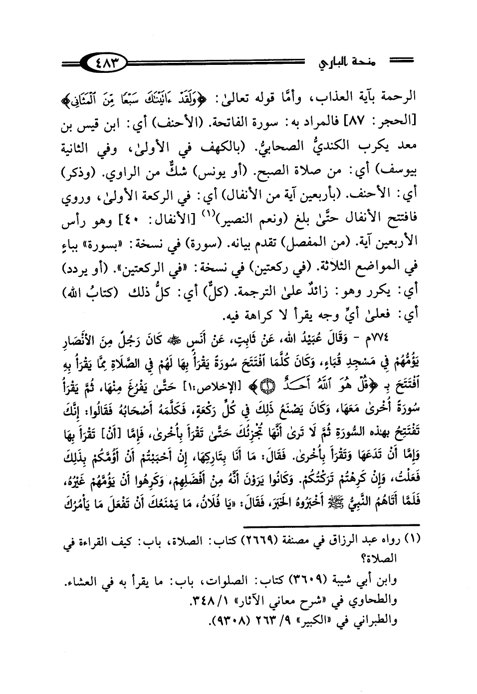 الرحمة بآية العذاب، وأما قوله تعالى: {وَلَقَدْ آتَيْنَاكَ سَبْعًا مِنَ الْمَثَانِي} [الحجر: 87] فالمراد به: سورة الفاتحة. (الأحنف) أي: ابن قيس بن معد يكرب الكنديُّ الصحابي. (بالكهف في الأولى، وفي الثانية بيوسف) أي: من صلاة الصبح. (أو يونس) شك من الراوي. (وذكر) أي: الأحنف. (بأربعين آية من الأنفال) أي: في الركعة الأولى، وروي فافتتح الأنفال حتى بلغ (ونعم النصير) (¬1) [الأنفال: 40] وهو رأس الأربعين آية. (من المفصل) تقدم بيانه. (سورة) في نسخة: "بسورة" بباء في المواضع الثلاثة. (في ركعتين) في نسخة: "في الركعتين". (أو يردد) أي: يكرر وهو: زائدٌ على الترجمة. (كلٌّ) أي: كلُّ ذلك (كتابُ الله) أي: فعلى أي وجه يقرأ لا كراهة فيه.