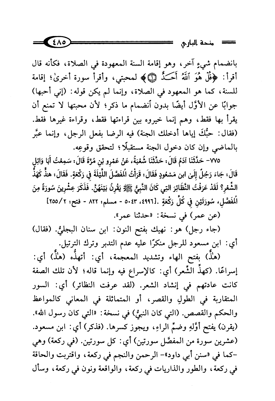 775 - حَدَّثَنَا آدَمُ، قَال: حَدَّثَنَا شُعْبَةُ، عَنْ عَمْرِو بْنِ مُرَّةَ، قَال: سَمِعْتُ أَبَا وَائِلٍ، قَال: جَاءَ رَجُلٌ إِلَى ابْنِ مَسْعُودٍ، فَقَال: قَرَأْتُ المُفَصَّلَ اللَّيْلَةَ فِي رَكْعَةٍ، فَقَال: "هَذًّا كَهَذِّ الشِّعْرِ، لَقَدْ عَرَفْتُ النَّظَائِرَ الَّتِي كَانَ النَّبِيُّ صَلَّى اللهُ عَلَيْهِ وَسَلَّمَ يَقْرُنُ بَيْنَهُنَّ، فَذَكَرَ عِشْرِينَ سُورَةً مِنَ المُفَصَّلِ، سُورَتَيْنِ فِي كُلِّ رَكْعَةٍ".
