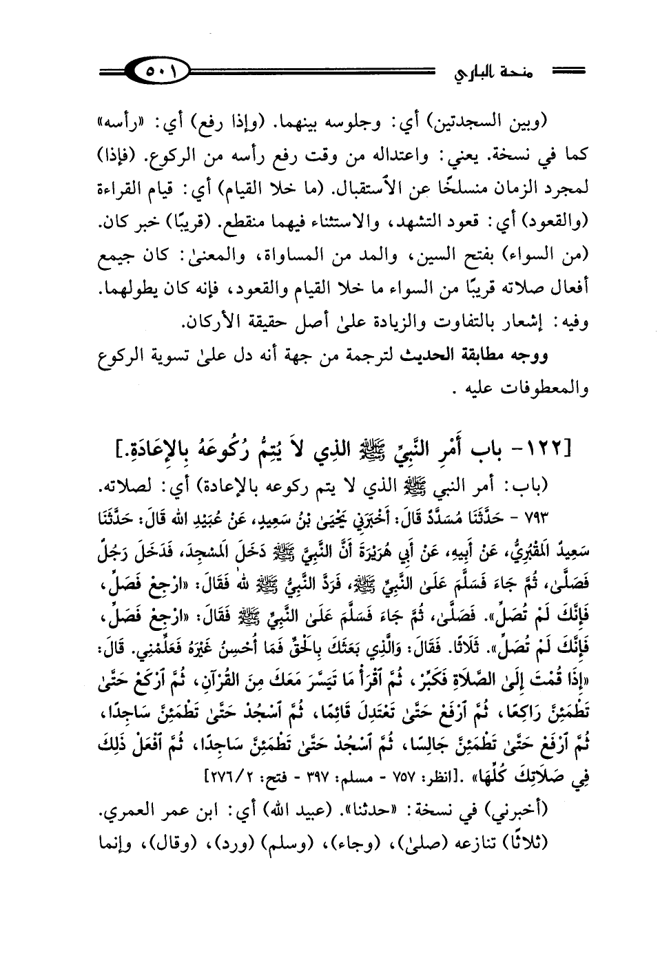 [122 - بَابُ أَمْرِ النَّبِيِّ صَلَّى اللهُ عَلَيْهِ وَسَلَّمَ الَّذِي لَا يُتِمُّ رُكُوعَهُ بِالإِعَادَةِ]
