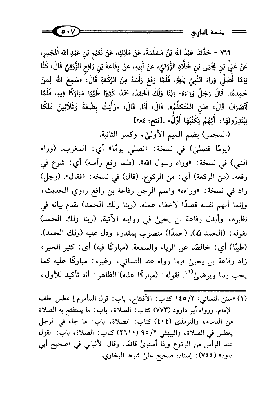 (يومًا فصلى) في نسخة: "نصلي يومًا" أي: المغرب. (وراء النبي) في نسخة: "وراء رسول الله". (فلما رفع رأسه) أي: شرع في رفعه. (من الركعة) أي: من الركوع. (قال) في نسخة: "فقال". (رجل) زاد في نسخة: "وراءه" واسم الرجل رفاعة بن رافع راوي الحديث، وإنما أبهم نفسه قصدًا لإخفاء عمله. (ربنا ولك الحمد) تقدم بيانه في نظيره، وأبدل رفاعة بن يحيى في روايته الآتية. (ربنا ولك الحمد) بقوله: (الحمد لله). (حمدًا) منصوب بمقدر، ودل عليه (ولك الحمد). (طيبًا) أي: خالصًا عن الرياء والسمعة. (مباركًا فيه) أي: كثير الخير، زاد رفاعة بن يحيى فيما رواه عنه النسائي، وغيره: مباركًا عليه كما يحب ربنا ويرضى (¬1). فقوله: (مباركًا عليه) الظاهر: أنه تأكيد للأول،