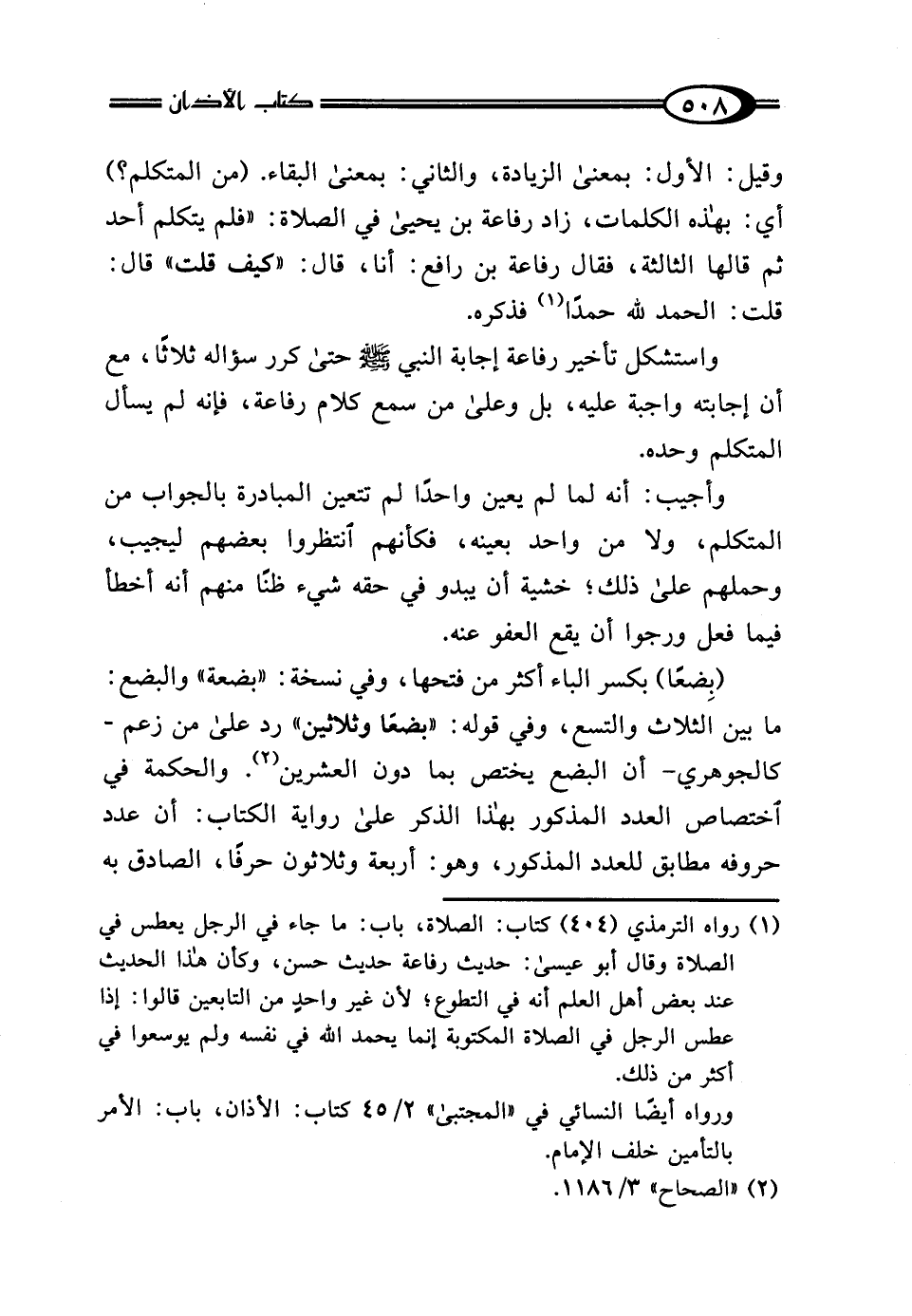 واستشكل تأخير رفاعة إجابة النبي - صلى الله عليه وسلم - حتى كرر سؤاله ثلاثًا، مع أن إجابته واجبة عليه، بل وعلى من سمع كلام رفاعة، فإنه لم يسأل المتكلم وحده.