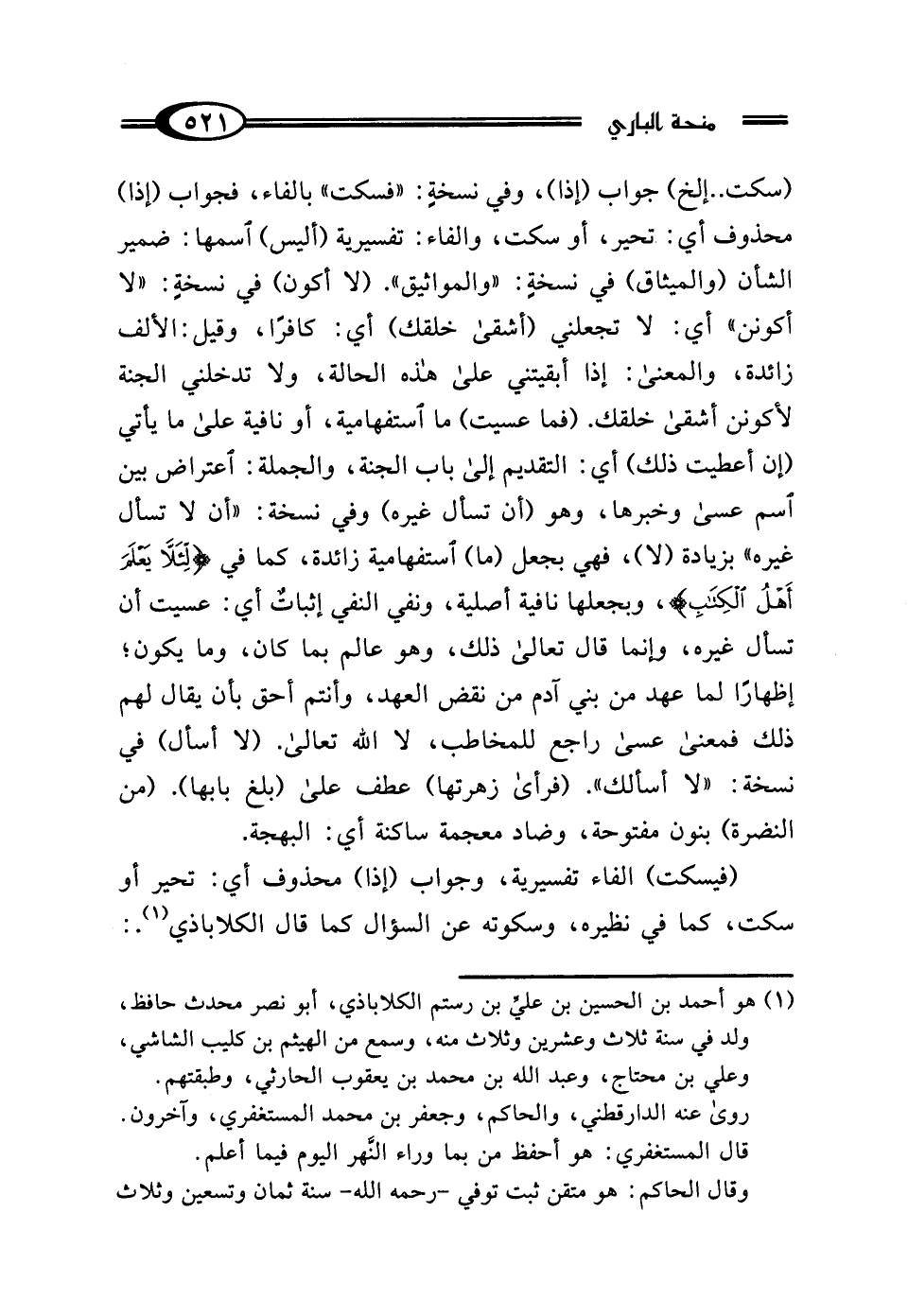 (فيسكت) الفاء تفسيرية، وجواب (إذا) محذوف أي: تحير أو سكت، كما في نظيره، وسكوته عن السؤال كما قال الكلاباذي (¬1).: