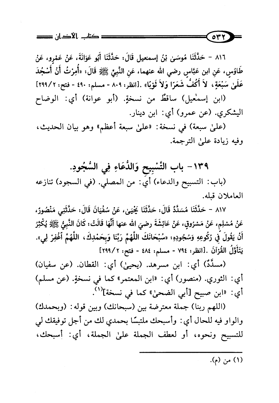 816 - حَدَّثَنَا مُوسَى بْنُ إِسْمَاعِيلَ، قَال: حَدَّثَنَا أَبُو عَوَانَةَ، عَنْ عَمْرٍو، عَنْ طَاوُسٍ، عَنِ ابْنِ عَبَّاسٍ رَضِيَ اللَّهُ عَنْهُمَا، عَنِ النَّبِيِّ صَلَّى اللهُ عَلَيْهِ وَسَلَّمَ قَال: "أُمِرْتُ أَنْ أَسْجُدَ عَلَى سَبْعَةٍ، لَا أَكُفُّ شَعَرًا وَلَا ثَوْبًا".