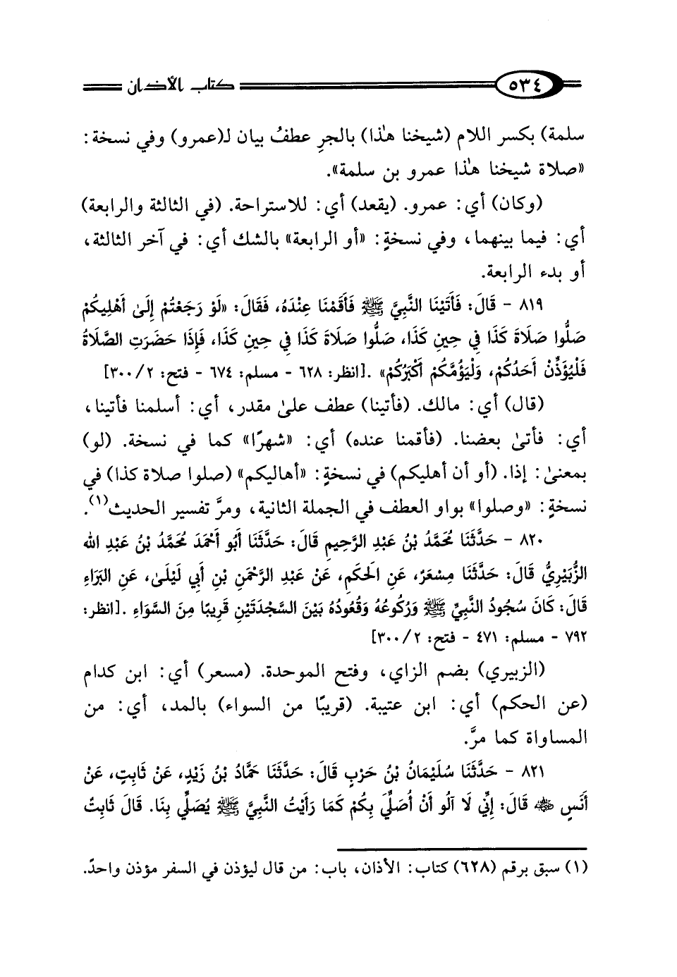 819 - قَال: فَأَتَيْنَا النَّبِيَّ صَلَّى اللهُ عَلَيْهِ وَسَلَّمَ، فَأَقَمْنَا عِنْدَهُ، فَقَال: "لَوْ رَجَعْتُمْ إِلَى أَهْلِيكُمْ صَلُّوا صَلاةَ كَذَا، فِي حِينِ كَذَا صَلُّوا صَلاةَ كَذَا، فِي حِينِ كَذَا، فَإِذَا حَضَرَتِ الصَّلاةُ، فَلْيُؤَذِّنْ أَحَدُكُمْ، وَلْيَؤُمَّكُمْ أَكْبَرُكُمْ".