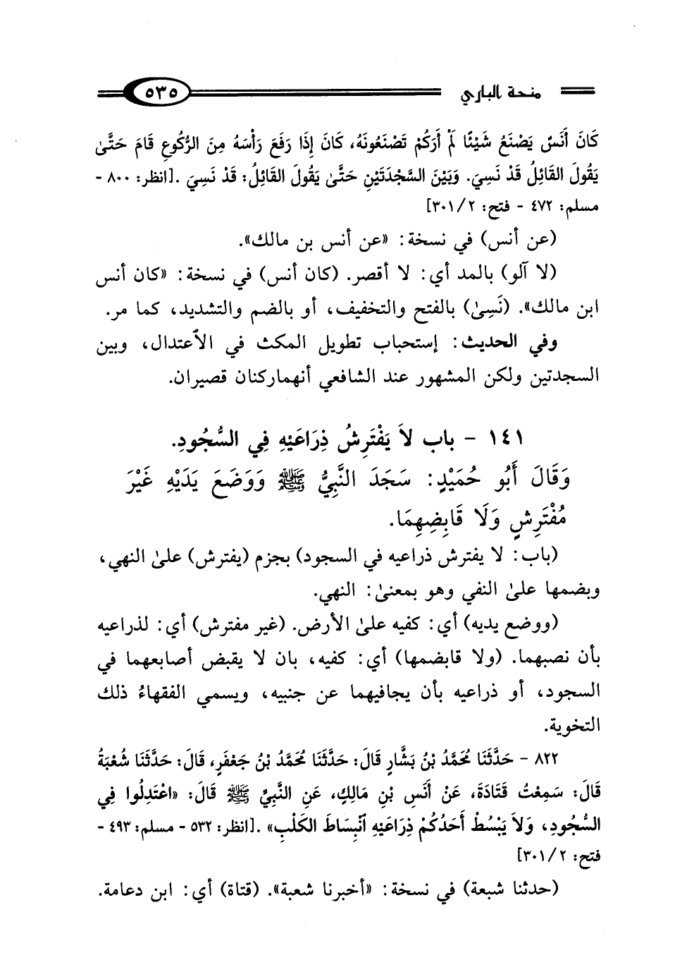 كَانَ أَنَسُ بْنُ مَالِكٍ يَصْنَعُ شَيْئًا لَمْ أَرَكُمْ تَصْنَعُونَهُ، كَانَ إِذَا رَفَعَ رَأْسَهُ مِنَ الرُّكُوعِ قَامَ حَتَّى يَقُولَ القَائِلُ: قَدْ نَسِيَ، وَبَيْنَ السَّجْدَتَيْنِ حَتَّى يَقُولَ القَائِلُ: قَدْ نَسِيَ".