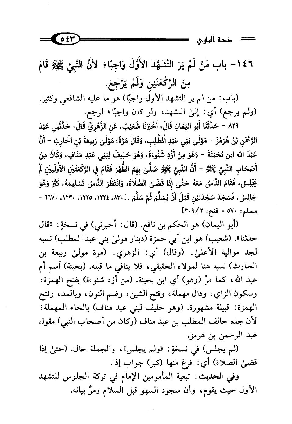 146 - بَابُ مَنْ لَمْ يَرَ التَّشَهُّدَ الأَوَّلَ وَاجِبًا لِأَنَّ النَّبِيَّ صَلَّى اللهُ عَلَيْهِ وَسَلَّمَ: "قَامَ مِنَ الرَّكْعَتَيْنِ وَلَمْ يَرْجِعْ"