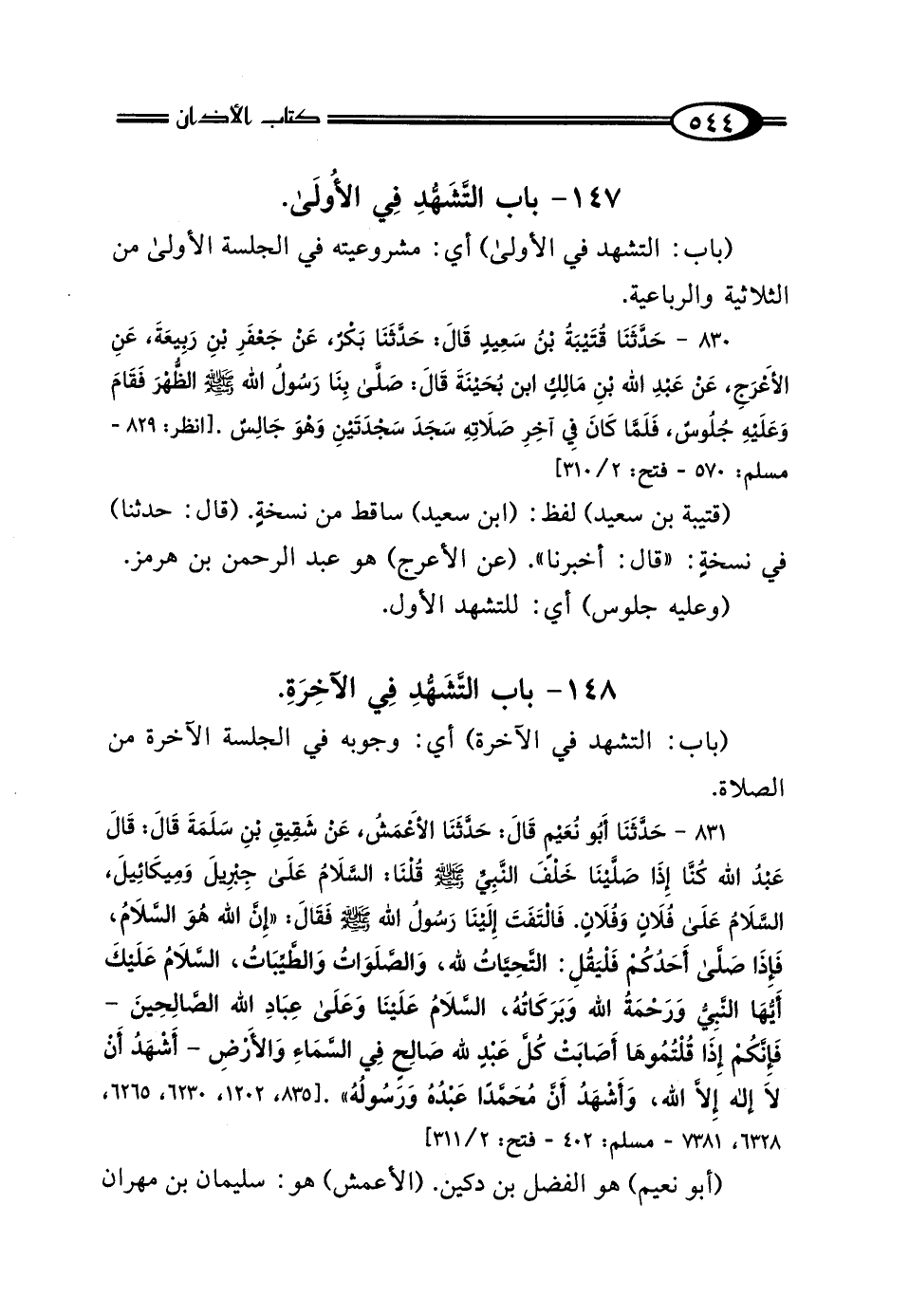 831 - حَدَّثَنَا أَبُو نُعَيْمٍ، قَال: حَدَّثَنَا الأَعْمَشُ، عَنْ شَقِيقِ بْنِ سَلَمَةَ، قَال: قَال عَبْدُ اللَّهِ: كُنَّا إِذَا صَلَّيْنَا خَلْفَ النَّبِيِّ صَلَّى اللهُ عَلَيْهِ وَسَلَّمَ، قُلْنَا: السَّلامُ عَلَى جِبْرِيلَ وَمِيكَائِيلَ السَّلامُ عَلَى فُلانٍ وَفُلانٍ، فَالْتَفَتَ إِلَيْنَا رَسُولُ اللَّهِ صَلَّى اللهُ عَلَيْهِ وَسَلَّمَ فَقَال: "إِنَّ اللَّهَ هُوَ السَّلامُ، فَإِذَا صَلَّى أَحَدُكُمْ، فَلْيَقُلْ: التَّحِيَّاتُ لِلَّهِ وَالصَّلَوَاتُ وَالطَّيِّبَاتُ، السَّلامُ عَلَيْكَ أَيُّهَا النَّبِيُّ وَرَحْمَةُ اللَّهِ وَبَرَكَاتُهُ، السَّلامُ عَلَيْنَا وَعَلَى عِبَادِ اللَّهِ الصَّالِحِينَ، فَإِنَّكُمْ إِذَا قُلْتُمُوهَا أَصَابَتْ كُلَّ عَبْدٍ لِلَّهِ صَالِحٍ فِي السَّمَاءِ وَالأَرْضِ، أَشْهَدُ أَنْ لَا إِلَهَ إلا اللَّهُ وَأَشْهَدُ أَنَّ مُحَمَّدًا عَبْدُهُ وَرَسُولُهُ".