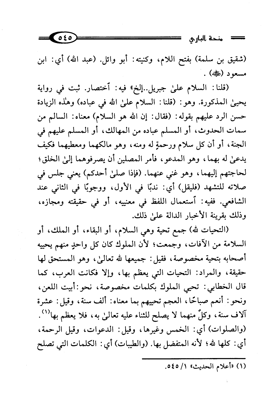 (قلنا: السلام على جبريل .. إلخ" فيه: اختصار. ثبت في رواية يحيى المذكورة. وهو: (قلنا: السلام على الله في عباده) وهذه الزيادة حسن الرد عليهم بقوله: (فقال: إن الله هو السلام) معناه: السالم من سمات الحدوث، أو المسلم عباده من المهالك، أو المسلم عليهم في الجنة، أو أن كل سلام ورحمةِ له ومنه، وهو مالكهما ومعطيهما فكيف يدعى له بهما، وهو المدعو، فأمر المصلين أن يصرفوهما إلى الخلق؛ لحاجتهم إليهما، وهو غني عنهما. (فإذا صلى أحدكم) يعني جلس في صلاته للتشهد (فليقل) أي: ندبًا في الأول، ووجوبًا في الثاني عند الشافعي. ففيه: استعمال اللفظ في معنييه، أو في حقيقته ومجازه، وذلك بقرينة الأخبار الدالة على ذلك.