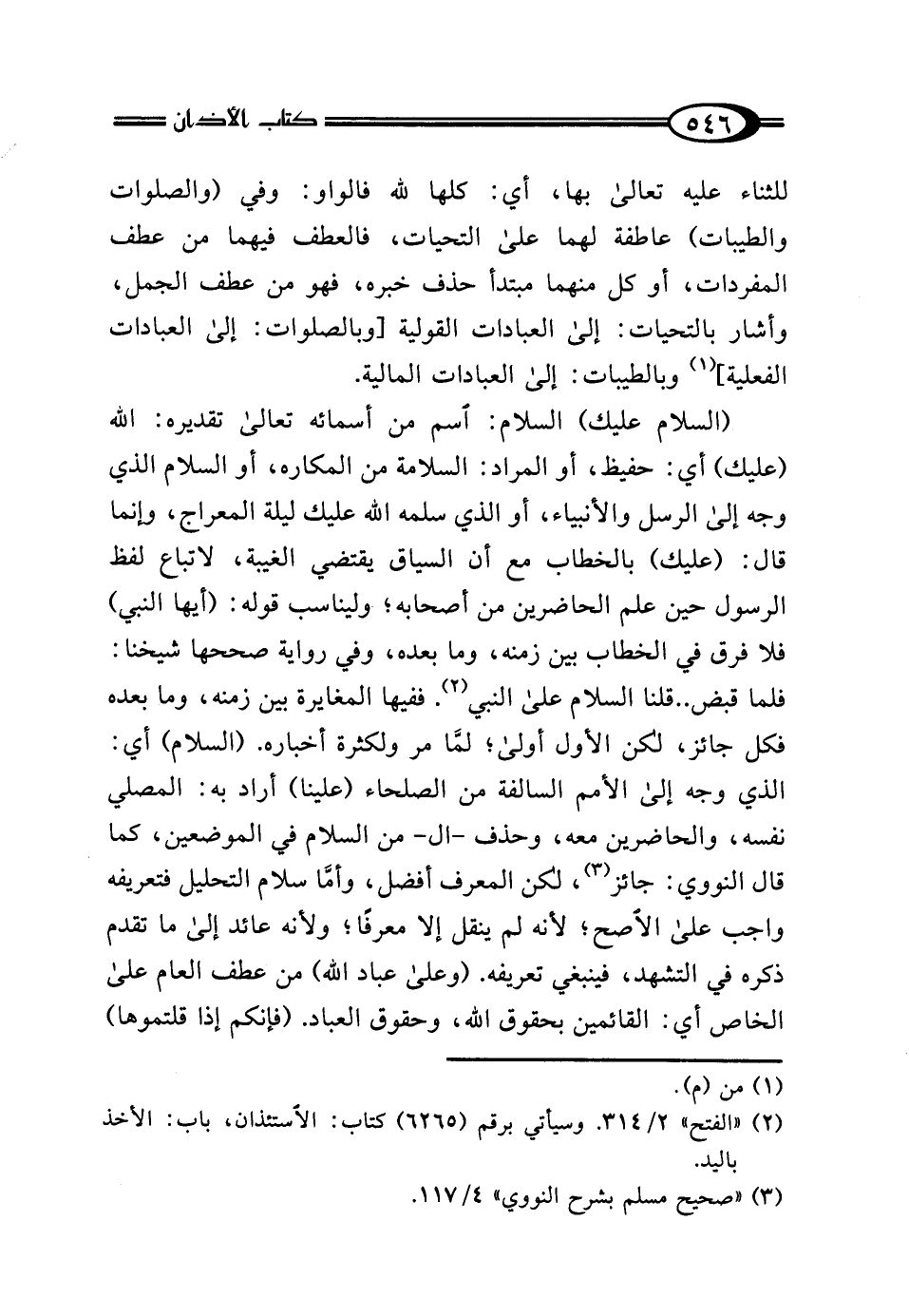 (السلام عليك) السلام: اسم من أسمائه تعالى تقديره: الله (عليك) أي: حفيظ، أو المراد: السلامة من المكاره، أو السلام الذي وجه إلى الرسل والأنبياء، أو الذي سلمه الله عليك ليلة المعراج، وإنما قال: (عليك) بالخطاب مع أن السياق يقتضي الغيبة، لاتباع لفظ الرسول حين علم الحاضرين من أصحابه؛ وليناسب قوله: (أيها النبي) فلا فرق في الخطاب بين زمنه، وما بعده، وفي رواية صححها شيخنا: فلما قبض .. قلنا السلام على النبي (¬2). ففيها المغايرة بين زمنه، وما بعده فكل جائز، لكن الأول أولى؛ لمَّا مر ولكثرة أخباره. (السلام) أي: الذي وجه إلى الأمم السالفة من الصلحاء (علينا) أراد به: المصلي نفسه، والحاضرين معه، وحذف -ال- من السلام في الموضعين، كما قال النووي: جائز (¬3)، لكن المعرف أفضل، وأمَّا سلام التحليل فتعريفه واجب على الأصح؛ لأنه لم ينقل إلا معرفًا؛ ولأنه عائد إلى ما تقدم ذكره في التشهد، فينبغي تعريفه. (وعلى عباد الله) من عطف العام على الخاص أي: القائمين بحقوق الله، وحقوق العباد. (فإنكم إذا قلتموها)