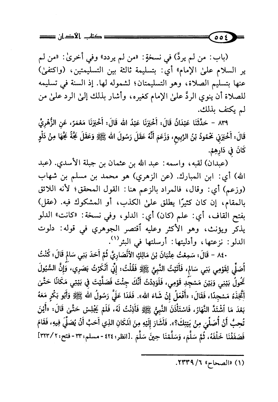 839 - حَدَّثَنَا عَبْدَانُ، قَال: أَخْبَرَنَا عَبْدُ اللَّهِ، قَال: أَخْبَرَنَا مَعْمَرٌ، عَنِ الزُّهْرِيِّ، قَال: أَخْبَرَنِي مَحْمُودُ بْنُ الرَّبِيعِ، وَزَعَمَ أَنَّهُ: "عَقَلَ رَسُولَ اللَّهِ صَلَّى اللهُ عَلَيْهِ وَسَلَّمَ، وَعَقَلَ مَجَّةً مَجَّهَا مِنْ دَلْوٍ كَانَ فِي دَارِهِمْ".