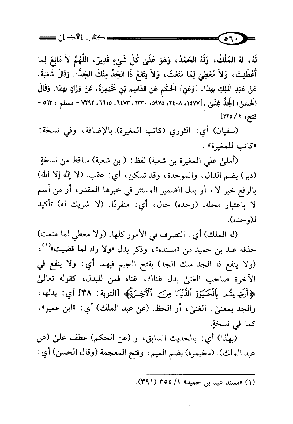 لَهُ، لَهُ المُلْكُ، وَلَهُ الحَمْدُ، وَهُوَ عَلَى كُلِّ شَيْءٍ قَدِيرٌ، اللَّهُمَّ لَا مَانِعَ لِمَا أَعْطَيْتَ، وَلَا مُعْطِيَ لِمَا مَنَعْتَ، وَلَا يَنْفَعُ ذَا الجَدِّ مِنْكَ الجَدُّ" وَقَال شُعْبَةُ: عَنْ عَبْدِ المَلِكِ بْنِ عُمَيْرٍ، بِهَذَا، وَعَنِ الحَكَمِ، عَنِ القَاسِمِ بْنِ مُخَيْمِرَةَ، عَنْ وَرَّادٍ، بِهَذَا، وَقَال الحَسَنُ: "الجَدُّ: غِنًى".