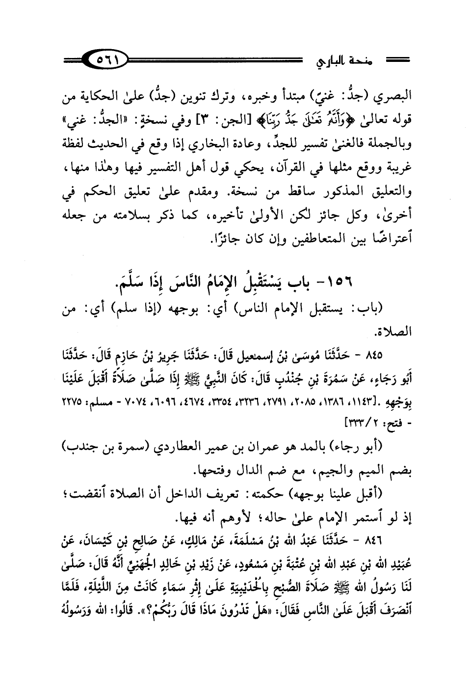 845 - حَدَّثَنَا مُوسَى بْنُ إِسْمَاعِيلَ، قَال: حَدَّثَنَا جَرِيرُ بْنُ حَازِمٍ، قَال: حَدَّثَنَا أَبُو رَجَاءٍ، عَنْ سَمُرَةَ بْنِ جُنْدَبٍ، قَال: "كَانَ النَّبِيُّ صَلَّى اللهُ عَلَيْهِ وَسَلَّمَ إِذَا صَلَّى صَلاةً أَقْبَلَ عَلَيْنَا بِوَجْهِهِ".