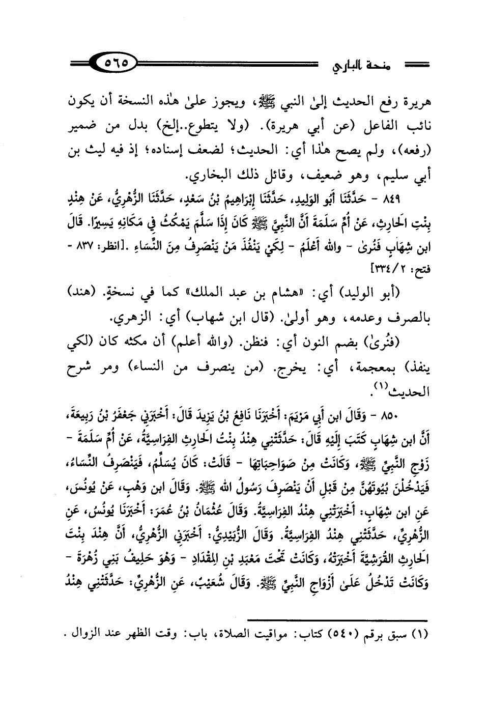 849 - حَدَّثَنَا أَبُو الوَلِيدِ، حَدَّثَنَا إِبْرَاهِيمُ بْنُ سَعْدٍ، حَدَّثَنَا الزُّهْرِيُّ، عَنْ هِنْدٍ بِنْتِ الحَارِثِ، عَنْ أُمِّ سَلَمَةَ: "أَنَّ النَّبِيَّ صَلَّى اللهُ عَلَيْهِ وَسَلَّمَ كَانَ إِذَا سَلَّمَ يَمْكُثُ فِي مَكَانِهِ يَسِيرًا" قَال ابْنُ شِهَابٍ: "فَنُرَى وَاللَّهُ أَعْلَمُ لِكَيْ يَنْفُذَ مَنْ يَنْصَرِفُ مِنَ النِّسَاءِ".
