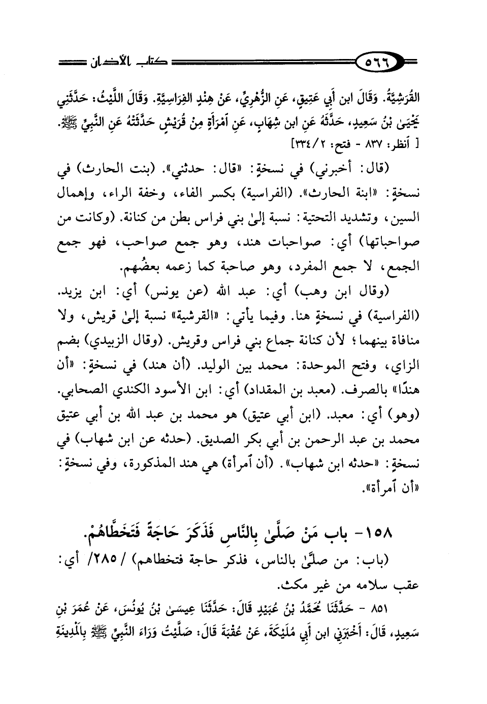 القُرَشِيَّةُ، وَقَال ابْنُ أَبِي عَتِيقٍ عَنِ الزُّهْرِيِّ، عَنْ هِنْدٍ الفِرَاسِيَّةِ، وَقَال اللَّيْثُ، حَدَّثَنِي يَحْيَى بْنُ سَعِيدٍ، حَدَّثَهُ عَنْ ابْنِ شِهَابٍ، عَنْ امْرَأَةٍ مِنْ قُرَيْشٍ، حَدَّثَتْهُ عَنِ النَّبِيِّ صَلَّى اللهُ عَلَيْهِ وَسَلَّمَ.