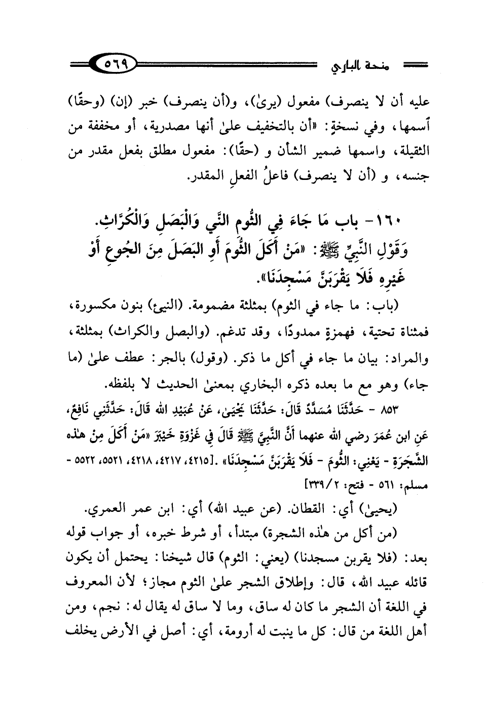853 - حَدَّثَنَا مُسَدَّدٌ، قَال: حَدَّثَنَا يَحْيَى، عَنْ عُبَيْدِ اللَّهِ، قَال: حَدَّثَنِي نَافِعٌ، عَنِ ابْنِ عُمَرَ رَضِيَ اللَّهُ عَنْهُمَا: أَنَّ النَّبِيَّ صَلَّى اللهُ عَلَيْهِ وَسَلَّمَ قَال فِي غَزْوَةِ خَيْبَرَ: "مَنْ أَكَلَ مِنْ هَذِهِ الشَّجَرَةِ - يَعْنِي الثُّومَ - فَلَا يَقْرَبَنَّ مَسْجِدَنَا".