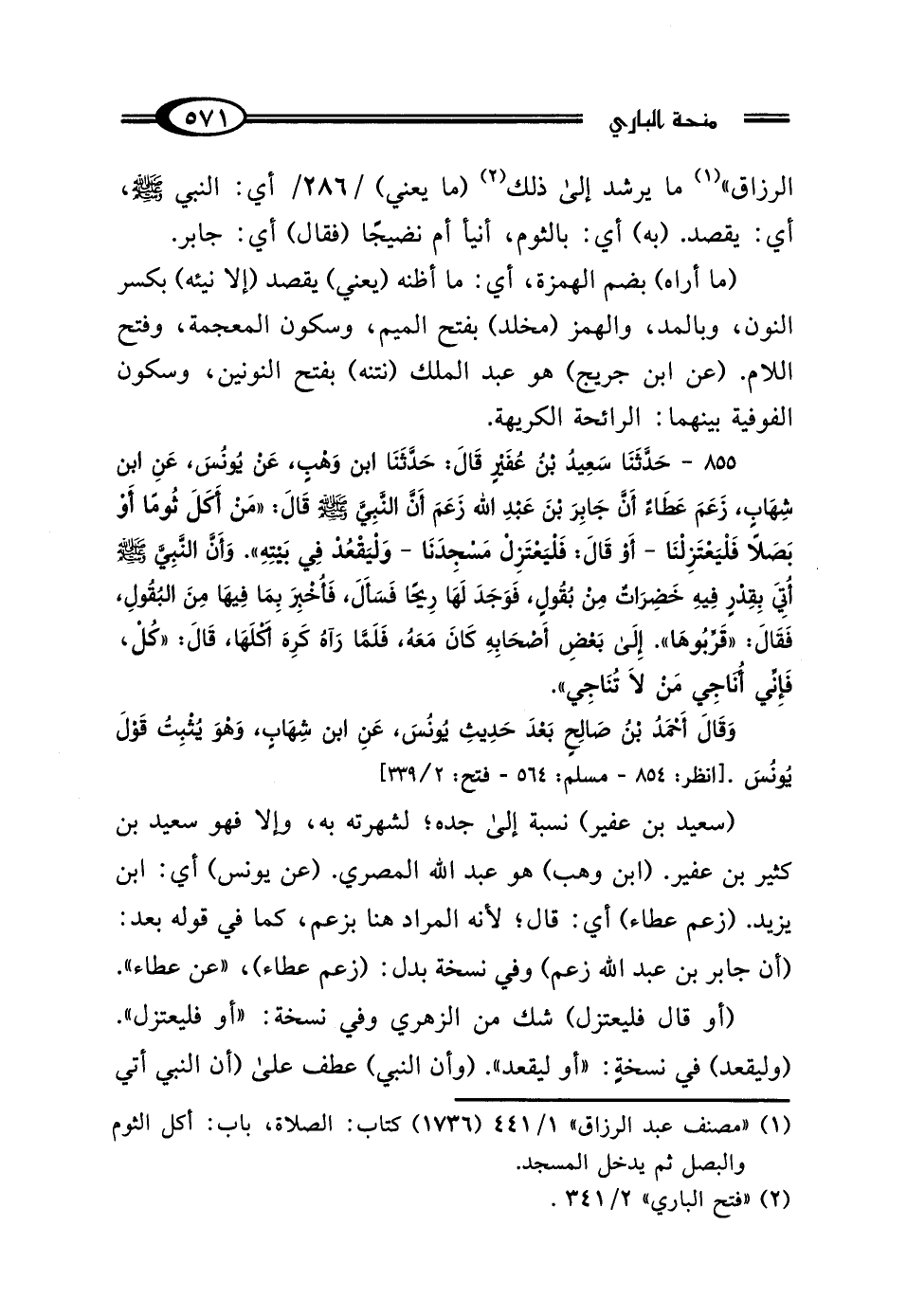 855 - حَدَّثَنَا سَعِيدُ بْنُ عُفَيْرٍ، قَال: حَدَّثَنَا ابْنُ وَهْبٍ، عَنْ يُونُسَ، عَنِ ابْنِ شِهَابٍ، زَعَمَ عَطَاءٌ، أَنَّ جَابِرَ بْنَ عَبْدِ اللَّهِ، زَعَمَ أَنَّ النَّبِيَّ صَلَّى اللهُ عَلَيْهِ وَسَلَّمَ قَال: "مَنْ أَكَلَ ثُومًا أَوْ بَصَلًا، فَلْيَعْتَزِلْنَا - أَوْ قَال: فَلْيَعْتَزِلْ مَسْجِدَنَا - وَلْيَقْعُدْ فِي بَيْتِهِ "