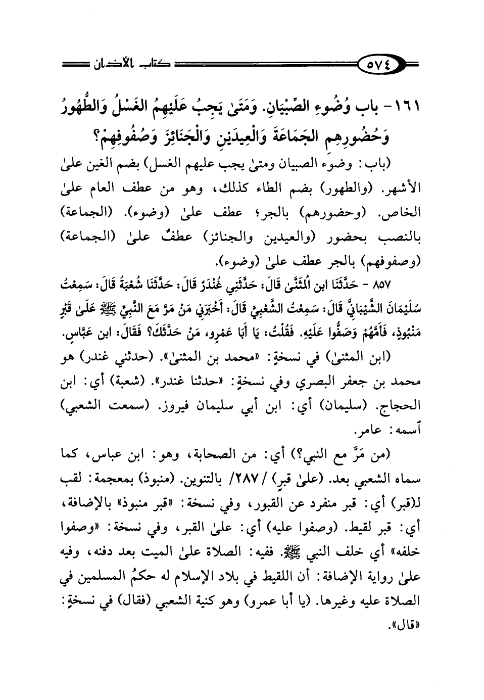 (باب: وضوء الصبيان ومتى يجب عليهم الغسل) بضم الغين عليه الأشهر. (والطهور) بضم الطاء كذلك، وهو من عطف العام عليه الخاص. (وحضورهم) بالجر؛ عطف على (وضوء). (الجماعة) بالنصب بحضور (والعيدين والجنائز) عطفٌ على (الجماعة) (وصفوفهم) بالجر عطف على (وضوء).