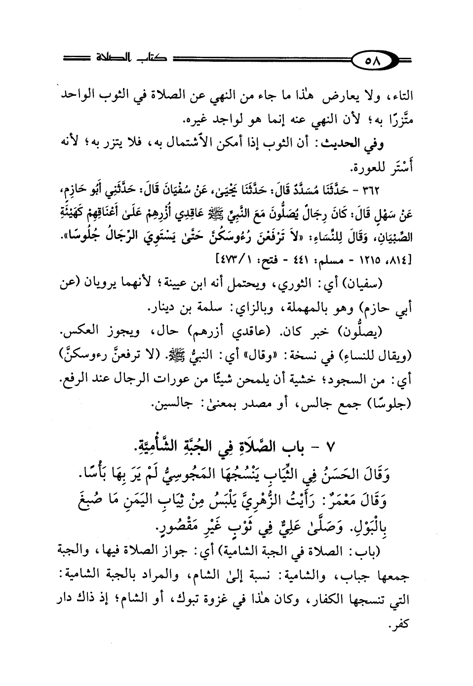362 - حَدَّثَنَا مُسَدَّدٌ، قَالَ: حَدَّثَنَا يَحْيَى، عَنْ سُفْيَانَ، قَالَ: حَدَّثَنِي أَبُو حَازِمٍ، عَنْ سَهْلِ بْنِ سَعْدٍ، قَالَ: كَانَ رِجَالٌ يُصَلُّونَ مَعَ النَّبِيِّ صَلَّى اللهُ عَلَيْهِ وَسَلَّمَ عَاقِدِي أُزْرِهِمْ عَلَى أَعْنَاقِهِمْ، كَهَيْئَةِ الصِّبْيَانِ، وَيُقَالُ لِلنِّسَاءِ: "لَا تَرْفَعْنَ رُءُوسَكُنَّ حَتَّى يَسْتَويَ الرِّجَالُ جُلُوسًا".