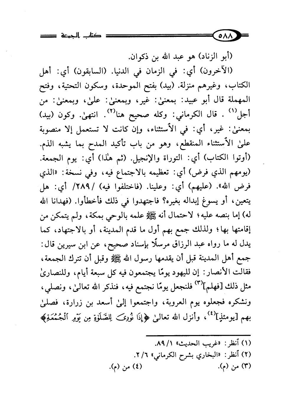 (الآخرون) أي: في الزمان في الدنيا. (السابقون) أي: أهل الكتاب، وغيرهم منزلة. (بيد) بفتح الموحدة، وسكون التحتية، وفتح المهملة قال أبو عبيد: بمعنى: غير، وبمعنى: على، وبمعنى: من أجل (¬1). قال الكرماني: وكله صحيح هنا (¬2). انتهى. وكون (بيد) بمعنى: غير، أي: في الاستثناء، وإن كانت لا تستعمل إلا منصوبة على الاستثناء المنقطع، وهو من باب تأكيد المدح بما يشبه الذم. (أوتوا الكتاب) أي: التوراة والإنجيل. (ثم هذا) أي: يوم الجمعة. (يومهم الذي فرض) أي: تعظيمه بالإجتماع فيه، وفي نسخة: "الذي فرض الله". (عليهم) أي: وعلينا. (فاختلفوا فيه) أي: هل يتعين، أو يسوغ إبداله بغيره؟ فاجتهدوا في ذلك فأخطأوا. (فهدانا الله له) إما بنصه عليه؛ لاحتمال أنه - صلى الله عليه وسلم - علمه بالوحي بمكة، ولم يتمكن من إقامتها بها؛ ولذلك جمع بهم أول ما قدم المدينة، أو بالاجتهاد، كما يدل له ما رواه عبد الرزاق مرسلًا بإسناد صحيح، عن ابن سيرين قال: جمع أهل المدينة قبل أن يقدمها رسول الله - صلى الله عليه وسلم - وقبل أن تترك الجمعة، فقالت الأنصار: إن لليهود يومًا يجتمعون فيه كل سبعة أيام، وللنصارى مثل ذلك [فهلم] (¬3) فلنجعل يومًا نجتمع فيه، فنذكر الله تعالى، ونصلي، ونشكره فجعلوه يوم العروبة، واجتمعوا إلى أسعد بن زرارة، فصلى بهم [يومئذٍ] (¬4)، وأنزل الله تعالى {إِذَا نُودِيَ لِلصَّلَاةِ مِنْ يَوْمِ الْجُمُعَةِ} [الجمعة: 9]