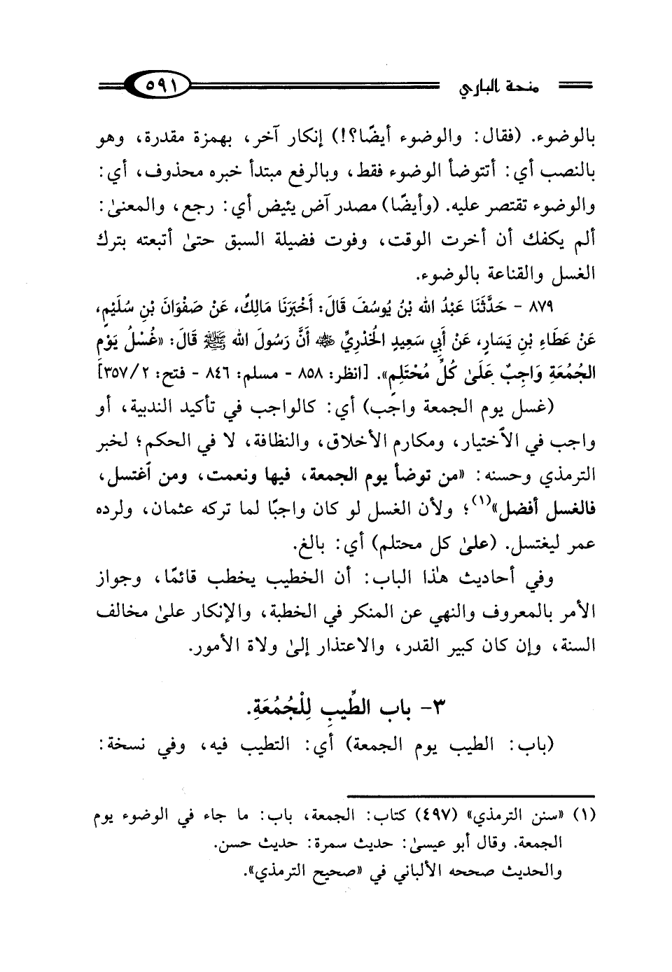(غسل يوم الجمعة واجب) أي: كالواجب في تأكيد الندبية، أو واجب في الاختيار، ومكارم الأخلاق، والنظافة، لا في الحكم؛ لخبر الترمذي وحسنه: "من توضأ يوم الجمعة، فيها ونعمت، ومن اغتسل، فالغسل أفضل" (¬1)؛ ولأن الغسل لو كان واجبًا لما تركه عثمان، ولرده عمر ليغتسل. (على كل محتلم) أي: بالغ.