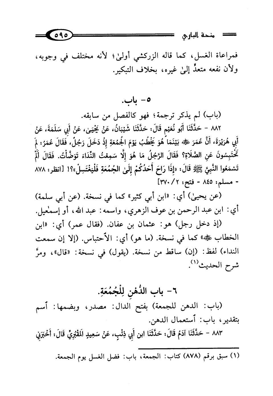 882 - حَدَّثَنَا أَبُو نُعَيْمٍ، قَال: حَدَّثَنَا شَيْبَانُ، عَنْ يَحْيَى هُوَ ابْنُ أَبِي كَثِيرٍ، عَنْ أَبِي سَلَمَةَ، عَنْ أَبِي هُرَيْرَةَ، أَنَّ عُمَرَ رَضِيَ اللَّهُ عَنْهُ، بَيْنَمَا هُوَ يَخْطُبُ يَوْمَ الجُمُعَةِ إِذْ دَخَلَ رَجُلٌ، فَقَال عُمَرُ بْنُ الخَطَّابِ رَضِيَ اللَّهُ عَنْهُ: لِمَ تَحْتَبِسُونَ عَنِ الصَّلاةِ؟ فَقَال الرَّجُلُ: مَا هُوَ إلا أَنْ سَمِعْتُ النِّدَاءَ تَوَضَّأْتُ، فَقَال: أَلَمْ تَسْمَعُوا النَّبِيَّ صَلَّى اللهُ عَلَيْهِ وَسَلَّمَ قَال: "إِذَا رَاحَ أَحَدُكُمْ إِلَى الجُمُعَةِ فَلْيَغْتَسِلْ"؟! [انظر: 878 - مسلم: 845 - فتح: 2/ 370]