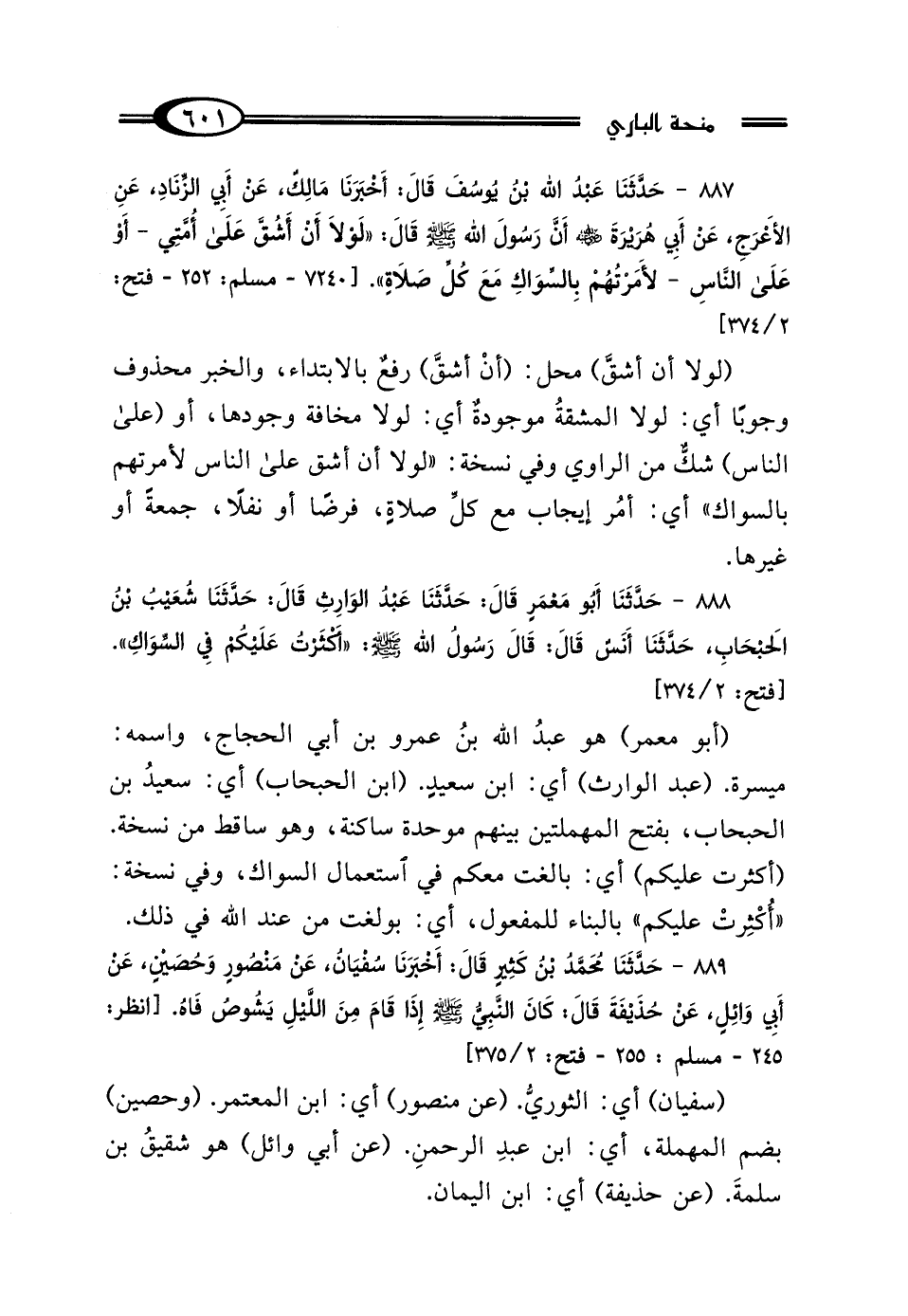 887 - حَدَّثَنَا عَبْدُ اللَّهِ بْنُ يُوسُفَ، قَال: أَخْبَرَنَا مَالِكٌ، عَنْ أَبِي الزِّنَادِ، عَنِ الأَعْرَجِ، عَنْ أَبِي هُرَيْرَةَ رَضِيَ اللَّهُ عَنْهُ: أَنَّ رَسُولَ اللَّهِ صَلَّى اللهُ عَلَيْهِ وَسَلَّمَ قَال: "لَوْلَا أَنْ أَشُقَّ عَلَى أُمَّتِي أَوْ عَلَى النَّاسِ لَأَمَرْتُهُمْ بِالسِّوَاكِ مَعَ كُلِّ صَلاةٍ".