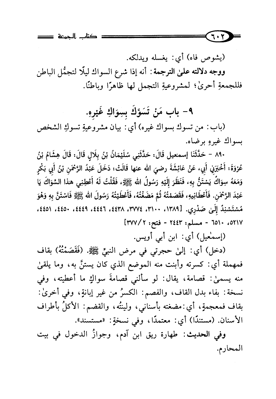 890 - حَدَّثَنَا إِسْمَاعِيلُ، قَال: حَدَّثَنِي سُلَيْمَانُ بْنُ بِلالٍ، قَال: قَال هِشَامُ بْنُ عُرْوَةَ: أَخْبَرَنِي أَبِي، عَنْ عَائِشَةَ رَضِيَ اللَّهُ عَنْهَا، قَالتْ: دَخَلَ عَبْدُ الرَّحْمَنِ بْنُ أَبِي بَكْرٍ وَمَعَهُ سِوَاكٌ يَسْتَنُّ بِهِ، فَنَظَرَ إِلَيْهِ رَسُولُ اللَّهِ صَلَّى اللهُ عَلَيْهِ وَسَلَّمَ، فَقُلْتُ لَهُ: أَعْطِنِي هَذَا السِّوَاكَ يَا عَبْدَ الرَّحْمَنِ، فَأَعْطَانِيهِ، فَقَصَمْتُهُ، ثُمَّ مَضَغْتُهُ "فَأَعْطَيْتُهُ رَسُولَ اللَّهِ صَلَّى اللهُ عَلَيْهِ وَسَلَّمَ، فَاسْتَنَّ بِهِ وَهُوَ مُسْتَسْنِدٌ إِلَى صَدْرِي".