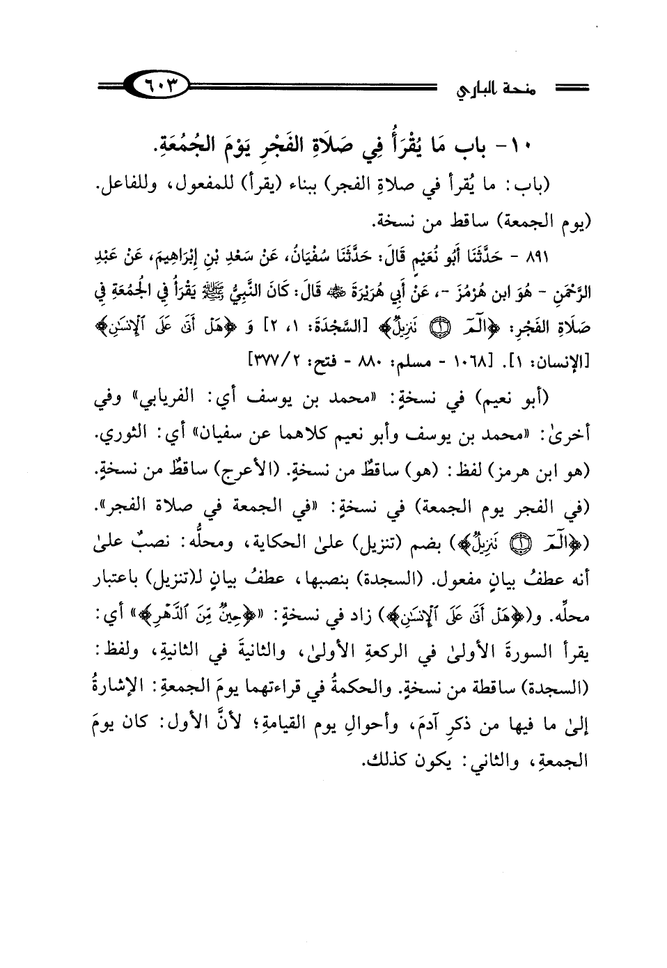 (أبو نعيم) في نسخةٍ: "محمد بن يوسف أي: الفريابي" وفي أخرى: "محمد بن يوسف وأبو نعيم كلاهما عن سفيان" أي: الثوري. (هو ابن هرمز) لفظ: (هو) ساقطٌ من نسخةٍ. (الأعرج) ساقطٌ من نسخةٍ. (في الفجر يوم الجمعة) في نسخةٍ: "في الجمعة في صلاة الفجر". ({الم (1) تَنْزِيلُ}) بضم (تنزيل) على الحكاية، ومحلُّه: نصبٌ على أنه عطفُ بيانٍ مفعول. (السجدة) بنصبها، عطفُ بيانٍ و (تنزيل) باعتبار محله. و ({هَلْ أَتَى عَلَى الْإِنْسَانِ}) زاد في نسخةٍ: " {حِينٌ مِنَ الدَّهْرِ} [الإنسان: 1] " أي: يقرأ السورةَ الأولى في الركعةِ الأولى، والثانيةَ في الثانيةِ، ولفظ: (السجدة) ساقطة من نسخةٍ. والحكمةُ في قراءتهما يومَ الجمعةِ: الإشارةُ إلى ما فيها من ذكرِ آدمَ، وأحوالِ يوم القيامةِ؛ لأنَّ الأول: كان يومَ الجمعةِ، والثاني: يكون كذلك.