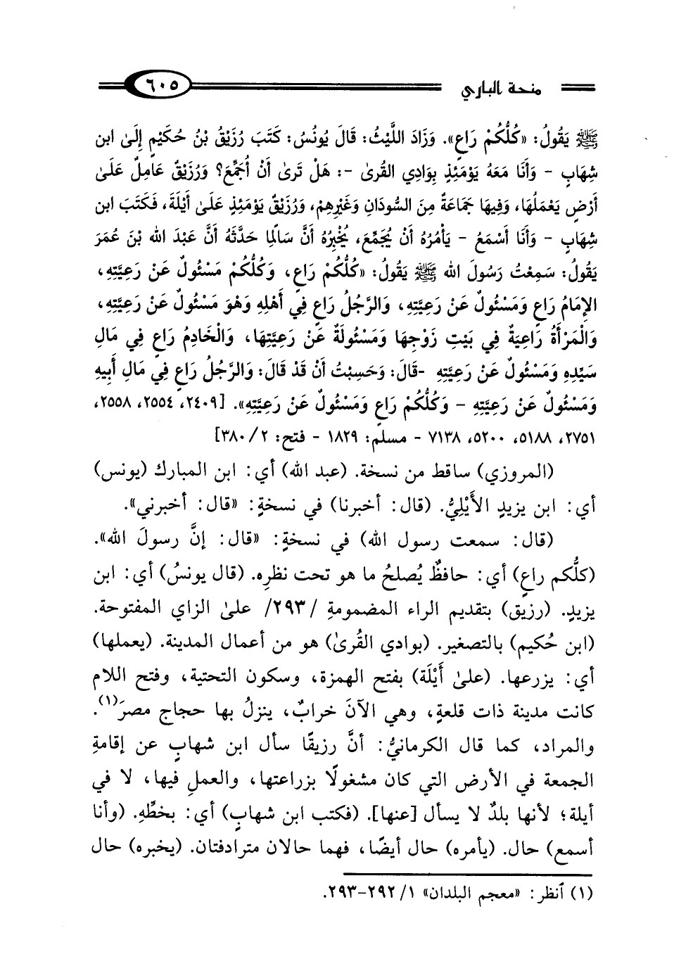 (قال: سمعت رسول الله) في نسخةٍ: "قال: إنَّ رسولَ الله". (كلُّكم راعٍ) أي: حافظٌ يُصلحُ ما هو تحت نظرِه. (قال يونسُ) أي: ابن يزيدٍ. (رزيق) بتقديم الراء المضمومةِ على الزاي المفتوحة. (ابن حُكيم) بالتصغير. (بوادي القُرى) هو من أعمال المدينة. (يعملها) أي: يزرعها. (على أَيْلَة) بفتح الهمزة، وسكون التحتية، وفتح اللام كانت مدينة ذات قلعةٍ، وهي الآنَ خرابٌ، ينزلُ بها حجاج مصرَ (¬1). والمراد، كما قال الكرمانيُّ: أن رزيقًا سأل ابن شهابٍ عن إقامةِ الجمعة في الأرض التي كان مشغولًا بزراعتها، والعملِ فيها، لا في أيلة؛ لأنها بلدٌ لا يسأل [عنها]. (فكتب ابن شهابٍ) أي: بخطِّهِ. (وأنا أسمع) حال. (يأمره) حال أيضًا، فهما حالان مترادفتان. (يخبره) حال