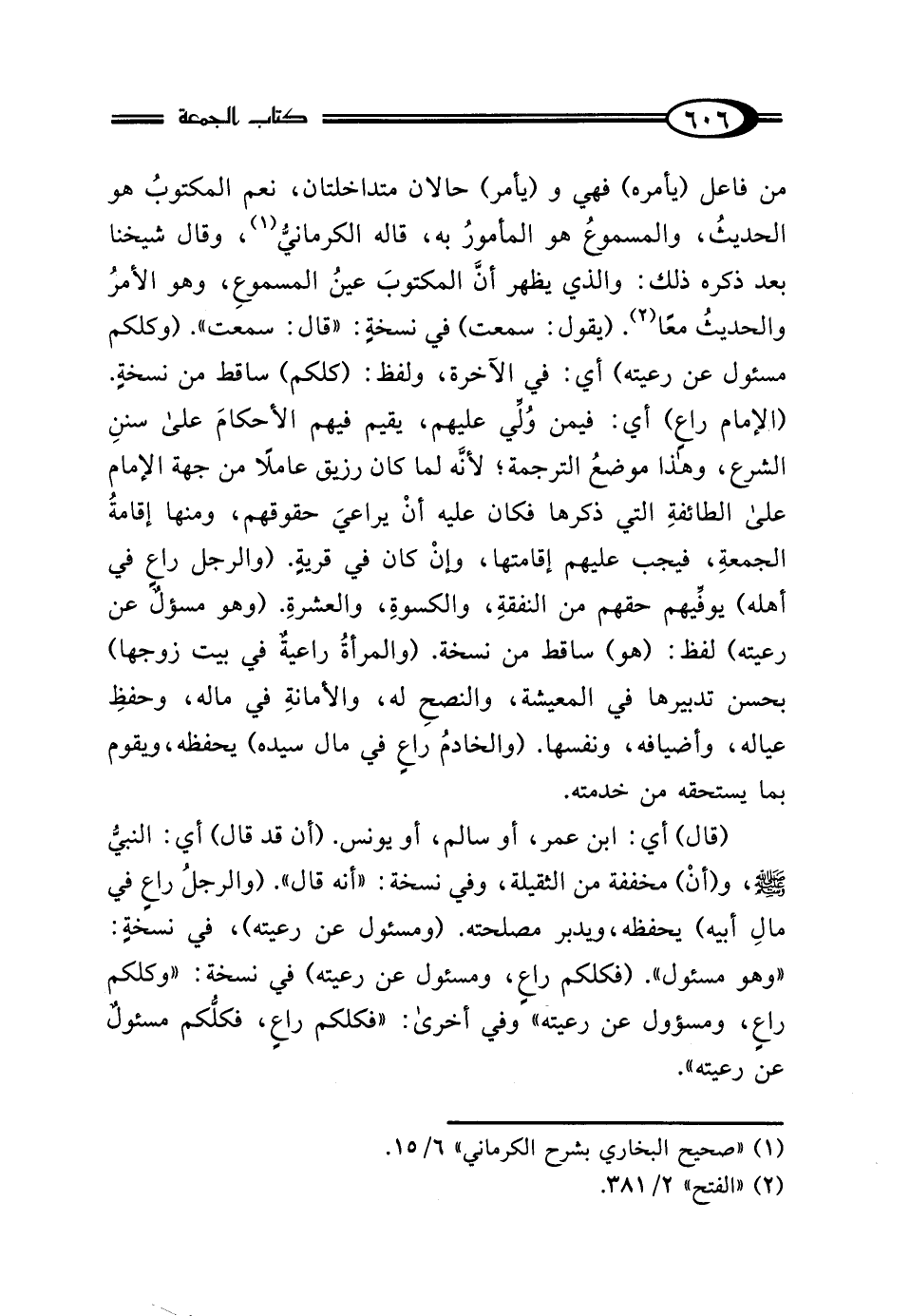 من فاعل (يأمره) فهي و (يأمر) حالان متداخلتان، نعم المكتوبُ هو الحديثُ، والمسموعُ هو المأمورُ به، قاله الكرمانيُّ (¬1)، وقال شيخنا بعد ذكره ذلك: والذي يظهر أنَّ المكتوبَ عينُ المسموعِ، وهو الأمرُ والحديثُ معًا (¬2). (يقول: سمعت) في نسخةٍ: "قال: سمعت". (وكلكم مسئول عن رعيته) أي: في الآخرة، ولفظ: (كلكم) ساقط من نسخةٍ. (الإمام راعٍ) أي: فيمن وُلِّي عليهم، يقيم فيهم الأحكامَ على سننِ الشرع، وهذا موضعُ الترجمة؛ لأنَّه لما كان رزيق عاملًا من جهة الإمام على الطائفةِ التي ذكرها فكان عليه أنْ يراعيَ حقوقهم، ومنها إقامة الجمعةِ، فيجب عليهم إقامتها، وإنْ كان في قريةٍ. (والرجل راعٍ في أهله) يوفِّيهم حقهم من النفقةِ، والكسوةِ، والعشرةِ. (وهو مسؤلٌ عن رعيته) لفظ: (هو) ساقط من نسخة. (والمرأةُ راعية في بيت زوجها) بحسن تدبيرها في المعيشة، والنصحِ له، والأمانةِ في ماله، وحفظِ عياله، وأضيافه، ونفسها. (والخادمُ راعٍ في مال سيده) يحفظه، ويقوم بما يستحقه من خدمته.