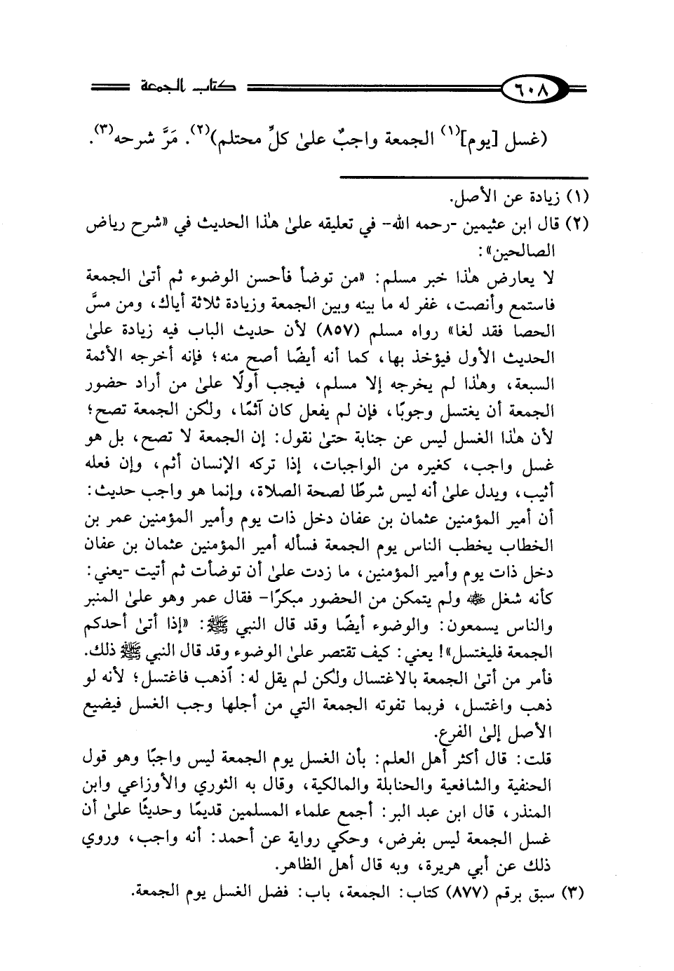 لا يعارض هذا خبر مسلم: "من توضأ فأحسن الوضوء ثم أتى الجمعة فاستمع وأنصت، غفر له ما بينه وبين الجمعة وزيادة ثلاثة أيام، ومن مسَّ الحصا فقد لغا" رواه مسلم (857) لأن حديث الباب فيه زيادة على الحديث الأول فيؤخذ بها، كما أنه أيضًا أصح منه؛ فإنه أخرجه الأئمة السبعة، وهذا لم يخرجه إلا مسلم، فيجب أولًا على من أراد حضور الجمعة أن يغتسل وجوبًا، فإن لم يفعل كان آثمًا، ولكن الجمعة تصح؛ لأن هذا الغسل ليس عن جنابة حتى نقول: إن الجمعة لا تصح، بل هو غسل واجب، كغيره من الواجبات، إذا تركه الإنسان أثم، وإن فعله أثيب، ويدل على أنه ليس شرطًا لصحة الصلاة، وإنما هو واجب حديث: أن أمير المؤمنين عثمان بن عفان دخل ذات يوم وأمير المؤمنين عمر بن الخطاب يخطب الناس يوم الجمعة فسأله أمير المؤمنين عثمان بن عفان دخل ذات يوم وأمير المؤمنين، ما زدت على أن توضأت ثم أتيت -يعني: كأنه شغل - رضي الله عنه - ولم يتمكن من الحضور مبكرًا- فقال عمر وهو على المنبر والناس يسمعون: والوضوء أيضًا وقد قال النبي - صلى الله عليه وسلم -: "إذا أتى أحدكم الجمعة فليغتسل"! يعني: كيف تقتصر على الوضوء وقد قال النبي - صلى الله عليه وسلم - ذلك. فأمر من أتى الجمعة بالاغتسال ولكن لم يقل له: اذهب فاغتسل؛ لأنه لو ذهب واغتسل، فربما تفوته الجمعة التي من أجلها وجب الغسل فيضيع الأصل إلى الفرع.