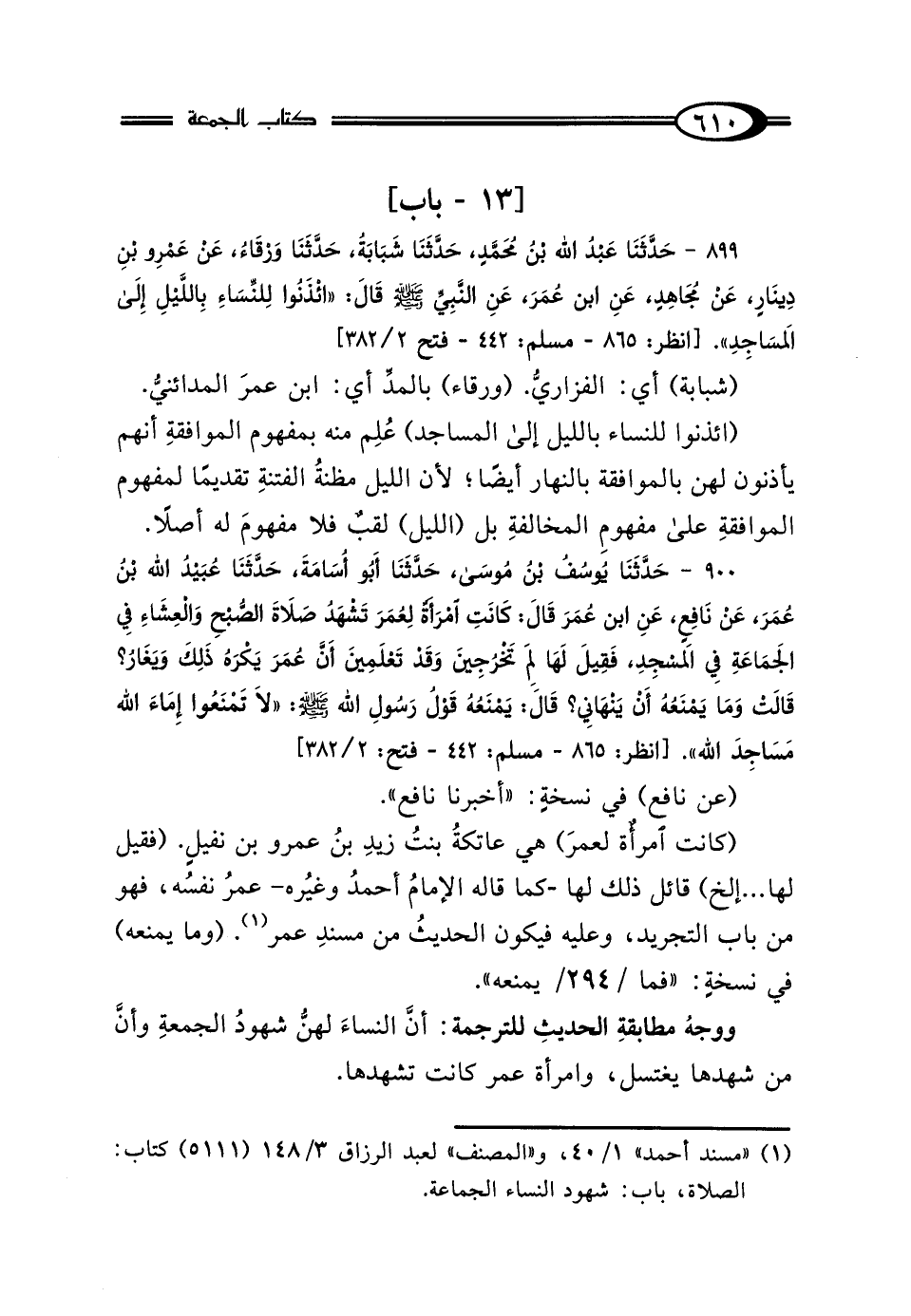 900 - حَدَّثَنَا يُوسُفُ بْنُ مُوسَى، حَدَّثَنَا أَبُو أُسَامَةَ، حَدَّثَنَا عُبَيْدُ اللَّهِ بْنُ عُمَرَ، عَنْ نَافِعٍ، عَنِ ابْنِ عُمَرَ، قَال: كَانَتِ امْرَأَةٌ لِعُمَرَ تَشْهَدُ صَلاةَ الصُّبْحِ وَالعِشَاءِ فِي الجَمَاعَةِ فِي المَسْجِدِ، فَقِيلَ لَهَا: لِمَ تَخْرُجِينَ وَقَدْ تَعْلَمِينَ أَنَّ عُمَرَ يَكْرَهُ ذَلِكَ وَيَغَارُ؟ قَالتْ: وَمَا يَمْنَعُهُ أَنْ يَنْهَانِي؟ قَال: يَمْنَعُهُ قَوْلُ رَسُولِ اللَّهِ صَلَّى اللهُ عَلَيْهِ وَسَلَّمَ: "لَا تَمْنَعُوا إِمَاءَ اللَّهِ مَسَاجِدَ اللَّهِ".