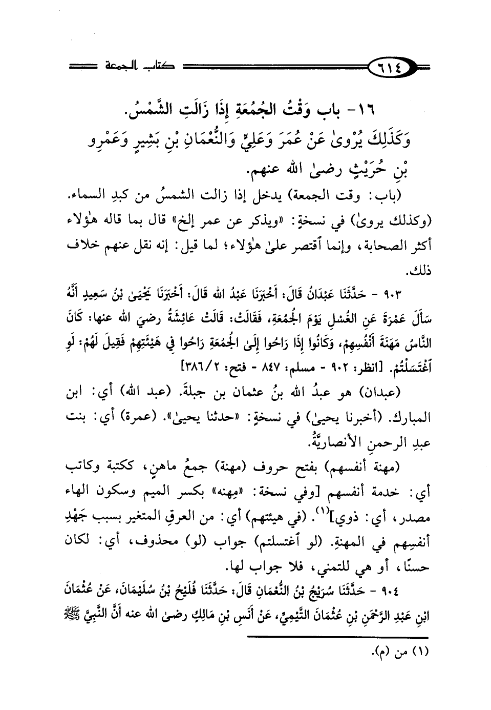 903 - حَدَّثَنَا عَبْدَانُ، قَال: أَخْبَرَنَا عَبْدُ اللَّهِ، قَال: أَخْبَرَنَا يَحْيَى بْنُ سَعِيدٍ: أَنَّهُ سَأَلَ عَمْرَةَ عَنِ الغُسْلِ يَوْمَ الجُمُعَةِ، فَقَالتْ: قَالتْ عَائِشَةُ رَضِيَ اللَّهُ عَنْهَا: "كَانَ النَّاسُ مَهَنَةَ أَنْفُسِهِمْ، وَكَانُوا إِذَا رَاحُوا إِلَى الجُمُعَةِ، رَاحُوا فِي هَيْئَتِهِمْ فَقِيلَ لَهُمْ: لَو اغْتَسَلْتُمْ".
