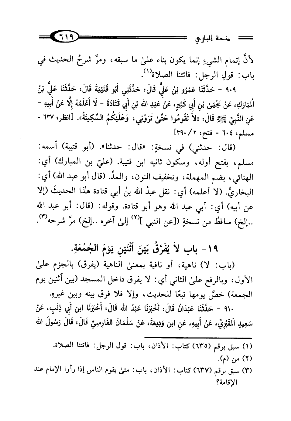909 - حَدَّثَنَا عَمْرُو بْنُ عَلِيٍّ، قَال: حَدَّثَنِي أَبُو قُتَيْبَةَ، قَال: حَدَّثَنَا عَلِيُّ بْنُ المُبَارَكِ، عَنْ يَحْيَى بْنِ أَبِي كَثِيرٍ، عَنْ عَبْدِ اللَّهِ بْنِ أَبِي قَتَادَةَ - لَا أَعْلَمُهُ إلا - عَنْ أَبِيهِ، عَنِ النَّبِيِّ صَلَّى اللهُ عَلَيْهِ وَسَلَّمَ قَال: "لَا تَقُومُوا حَتَّى تَرَوْنِي، وَعَلَيْكُمُ السَّكِينَةُ".