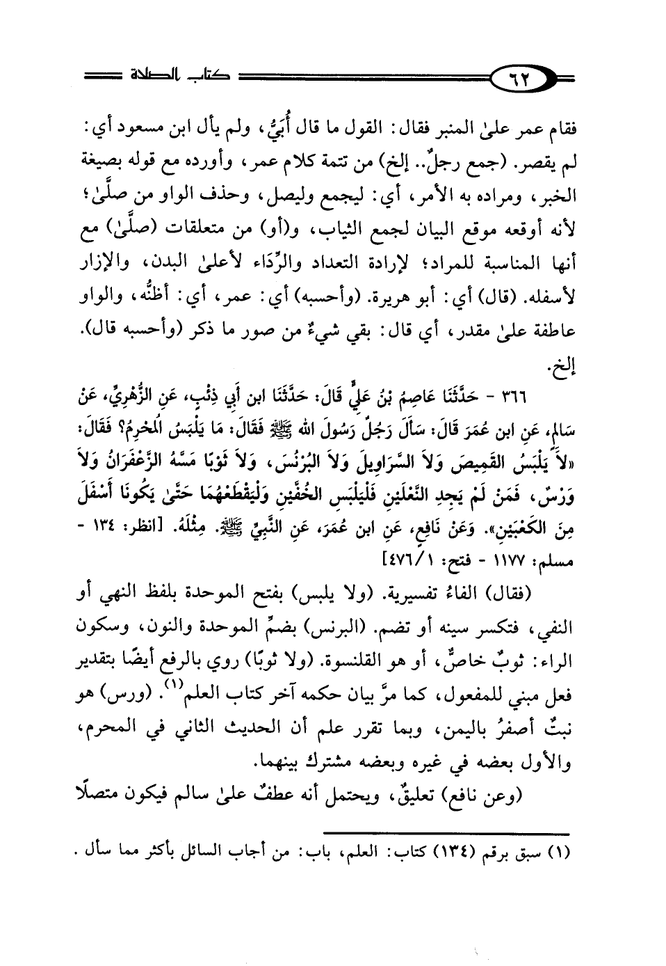 366 - حَدَّثَنَا عَاصِمُ بْنُ عَلِيٍّ، قَالَ: حَدَّثَنَا ابْنُ أَبِي ذِئْبٍ، عَنِ الزُّهْرِيِّ، عَنْ سَالِمٍ، عَنِ ابْنِ عُمَرَ، قَالَ: سَأَلَ رَجُلٌ رَسُولَ اللَّهِ صَلَّى اللهُ عَلَيْهِ وَسَلَّمَ، فَقَالَ: مَا يَلْبَسُ المُحْرِمُ؟ فَقَالَ: "لَا يَلْبَسُ القَمِيصَ وَلَا السَّرَاويلَ، وَلَا البُرْنُسَ، وَلَا ثَوْبًا مَسَّهُ الزَّعْفَرَانُ، وَلَا وَرْسٌ، فَمَنْ لَمْ يَجِدِ النَّعْلَيْنِ فَلْيَلْبَسِ الخُفَّيْنِ، وَلْيَقْطَعْهُمَا حَتَّى يَكُونَا أَسْفَلَ مِنَ الكَعْبَيْنِ"، وَعَنْ نَافِعٍ، عَنْ ابْنِ عُمَرَ، عَنِ النَّبِيِّ صَلَّى اللهُ عَلَيْهِ وَسَلَّمَ مِثْلَهُ.