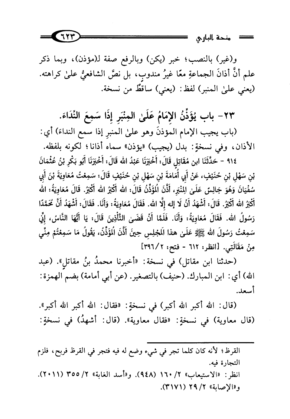(قال: الله أكبر الله أكبر) في نسخةٍ: "فقال: الله أكبر الله أكبر". (قال معاوية) في نسخةٍ: "فقال معاوية". (قال: أشهدُ) في نسخةٍ: