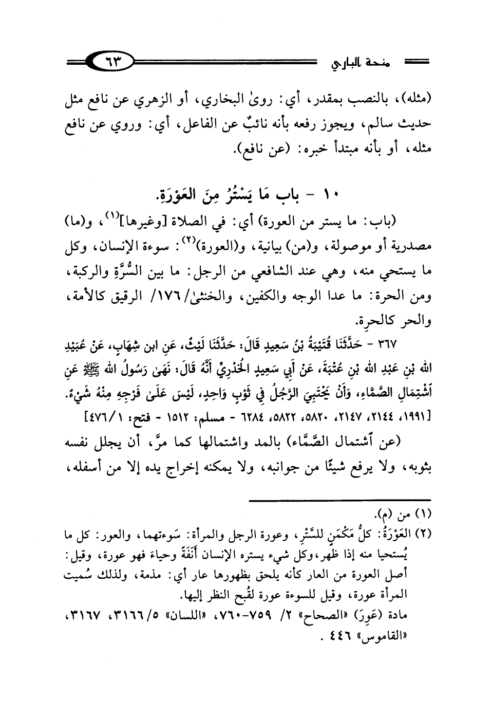 367 - حَدَّثَنَا قُتَيْبَةُ بْنُ سَعِيدٍ، قَالَ: حَدَّثَنَا لَيْثٌ، عَنِ ابْنِ شِهَابٍ، عَنْ عُبَيْدِ اللَّهِ بْنِ عَبْدِ اللَّهِ بْنِ عُتْبَةَ، عَنْ أَبِي سَعِيدٍ الخُدْرِيِّ، أَنَّهُ قَالَ: "نَهَى رَسُولُ اللَّهِ صَلَّى اللهُ عَلَيْهِ وَسَلَّمَ عَنِ اشْتِمَالِ الصَّمَّاءِ، وَأَنْ يَحْتَبِيَ الرَّجُلُ فِي ثَوْبٍ وَاحِدٍ، لَيْسَ عَلَى فَرْجِهِ مِنْهُ شَيْءٌ".