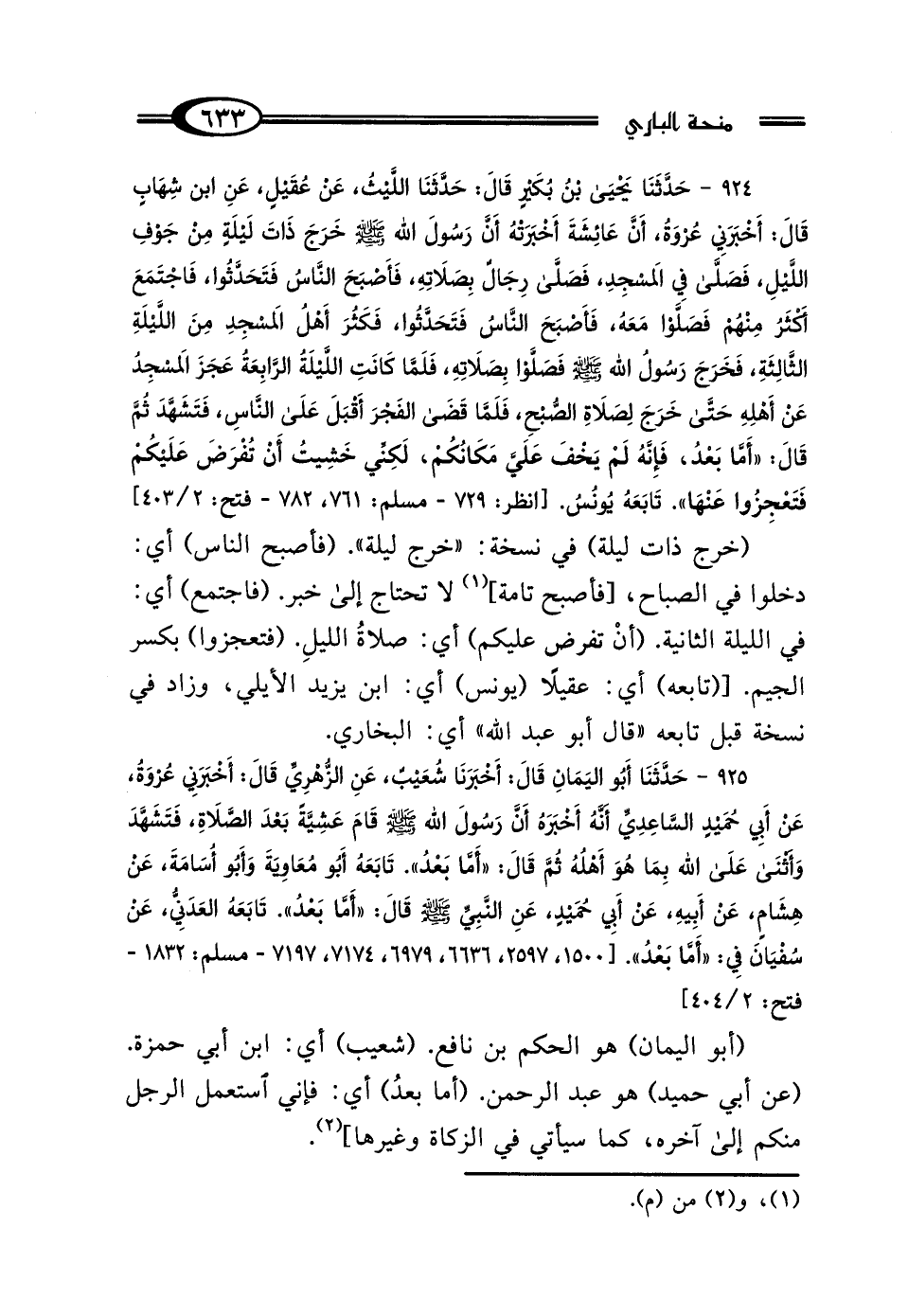 925 - حَدَّثَنَا أَبُو اليَمَانِ، قَال: أَخْبَرَنَا شُعَيْبٌ، عَنِ الزُّهْرِيِّ، قَال: أَخْبَرَنِي عُرْوَةُ، عَنْ أَبِي حُمَيْدٍ السَّاعِدِيِّ، أَنَّهُ أَخْبَرَهُ: أَنَّ رَسُولَ اللَّهِ صَلَّى اللهُ عَلَيْهِ وَسَلَّمَ قَامَ عَشِيَّةً بَعْدَ الصَّلاةِ، فَتَشَهَّدَ وَأَثْنَى عَلَى اللَّهِ بِمَا هُوَ أَهْلُهُ، ثُمَّ قَال: "أَمَّا بَعْدُ" تَابَعَهُ أَبُو مُعَاويَةَ، وَأَبُو أُسَامَةَ، عَنْ هِشَامٍ، عَنْ أَبِيهِ، عَنْ أَبِي حُمَيْدٍ السَّاعِدِيِّ، عَنِ النَّبِيِّ صَلَّى اللهُ عَلَيْهِ وَسَلَّمَ، قَال: "أَمَّا بَعْدُ"، تَابَعَهُ العَدَنِيُّ، عَنْ سُفْيَانَ فِي "أَمَّا بَعْدُ".