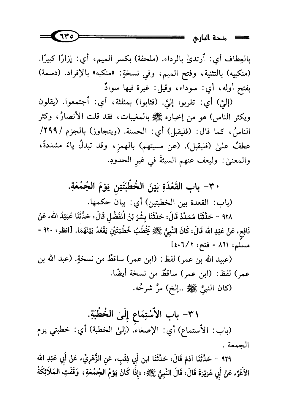 928 - حَدَّثَنَا مُسَدَّدٌ، قَال: حَدَّثَنَا بِشْرُ بْنُ المُفَضَّلِ، قَال: حَدَّثَنَا عُبَيْدُ اللَّهِ بْنُ عُمَرَ، عَنْ نَافِعٍ، عَنْ عَبْدِ اللَّهِ بْنِ عُمَرَ رَضِيَ اللَّهُ عَنْهُمَا، قَال: "كَانَ النَّبِيُّ صَلَّى اللهُ عَلَيْهِ وَسَلَّمَ يَخْطُبُ خُطْبَتَيْنِ يَقْعُدُ بَيْنَهُمَا".